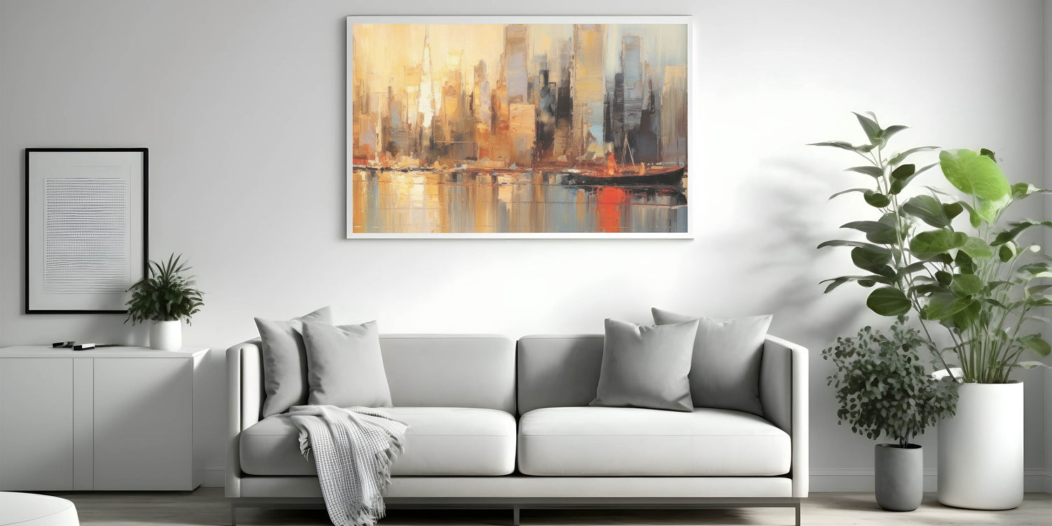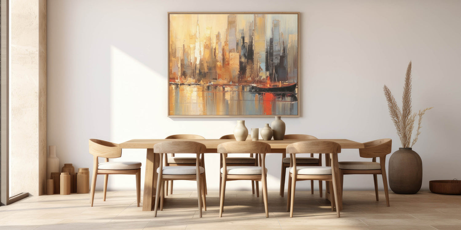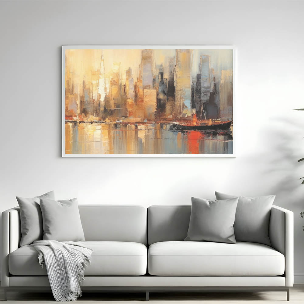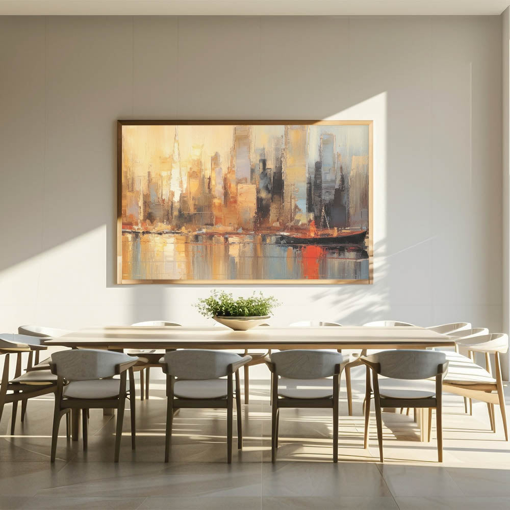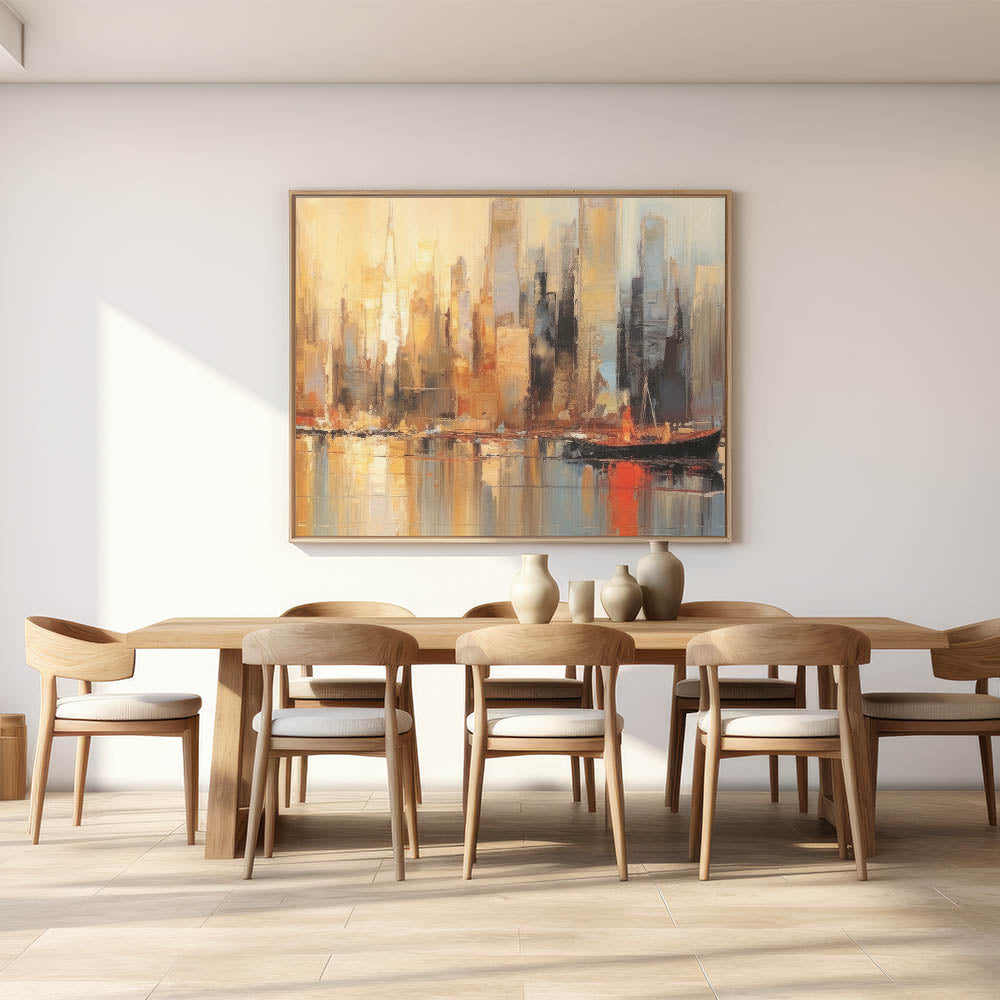 Introduce a touch of sophistication to your home with our Modern Landscape Abstract wall art. This piece features a vibrant cityscape reflected on a calm water surface, blending warm earth tones with subtle blues and grays. It's perfect for adding a dynamic and contemporary feel to any space.