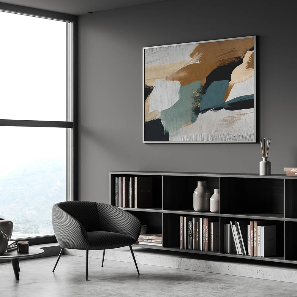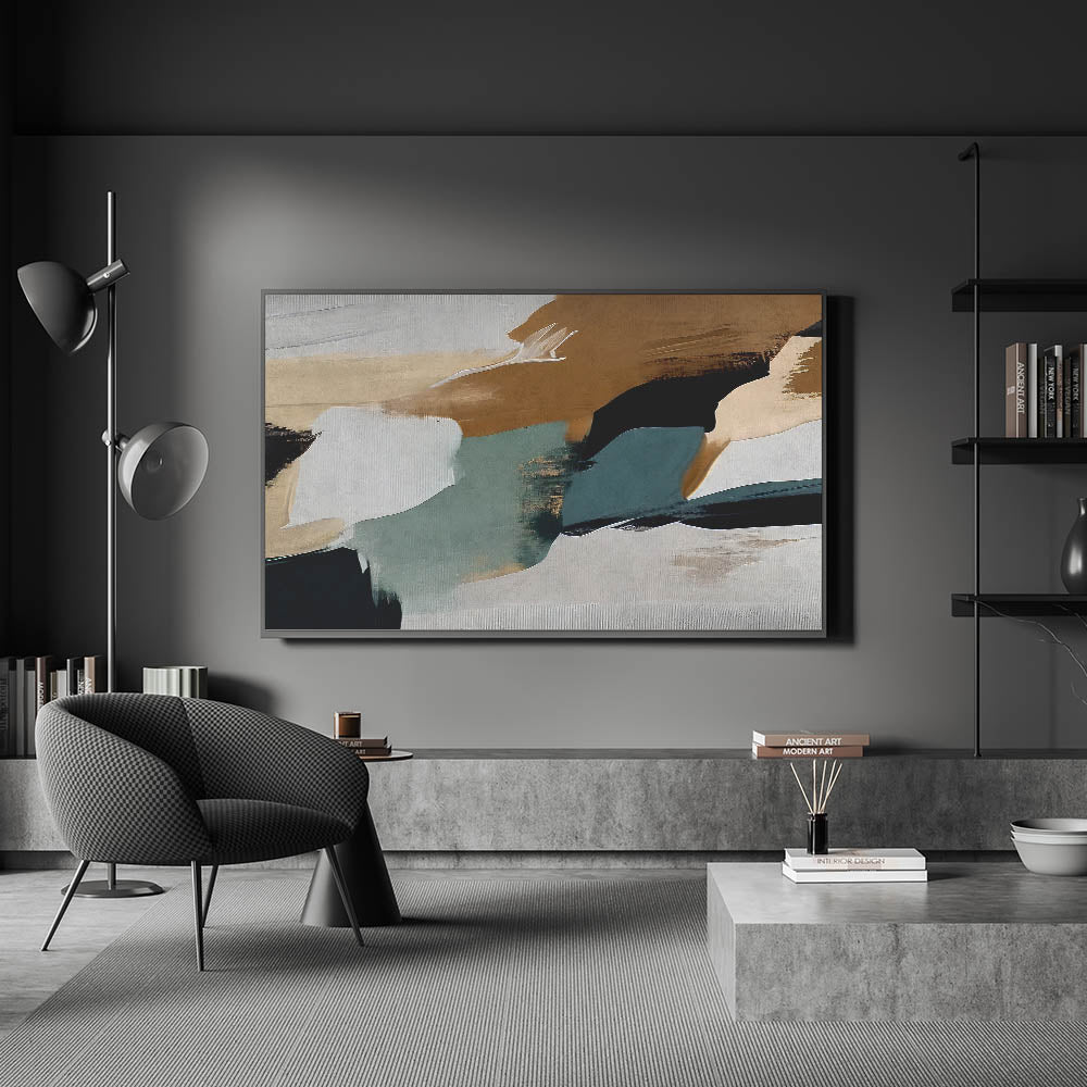 Elevate your space with this striking Modern Strokes and Lines Abstract Art. This captivating piece showcases a harmonious blend of dynamic brush strokes and geometric shapes, creating a perfect balance between contemporary design and artistic expression. The design features earthy tones with a mix of dark and muted colors, making it a versatile addition to any room.