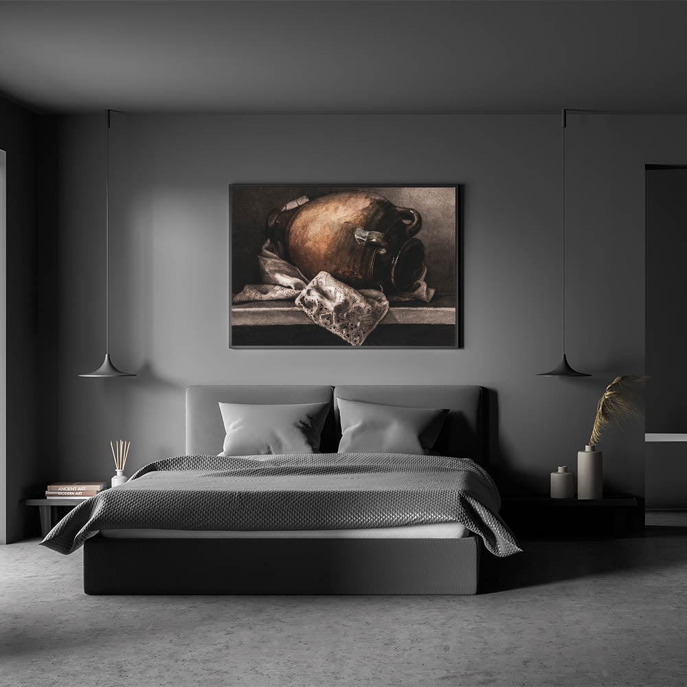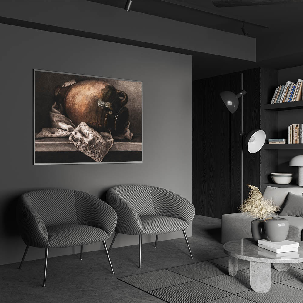 Bring a sense of classic elegance to your space with this Moody Still Life Vase Art. This piece captures a rustic vase resting on a delicate lace cloth, enveloped in shadowy tones that emphasize its antique charm. The detailed textures and rich, dark colors create a dramatic focal point that is perfect for anyone looking to enhance their interior with moody and timeless decor. Ideal for living rooms, dining areas, or studies, this wall art brings a sense of sophistication and vintage charm.