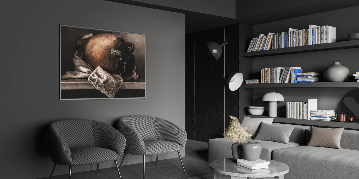 - A classic still life that invites viewers to appreciate the beauty of simple, everyday objects in a moody, artistic context.