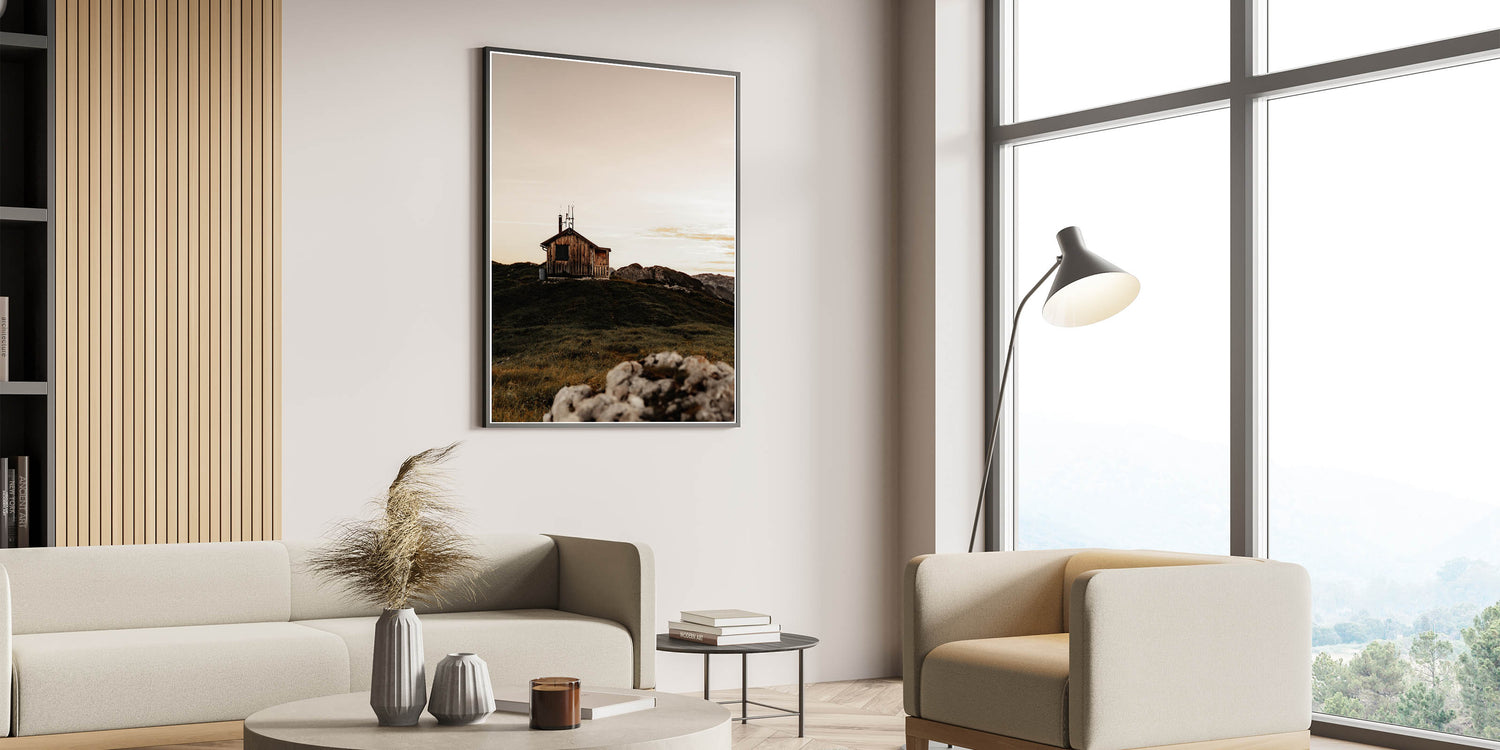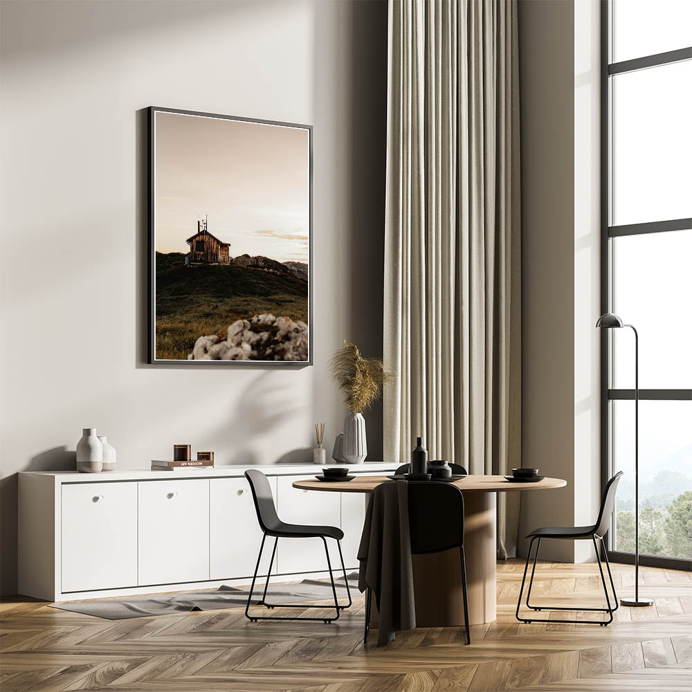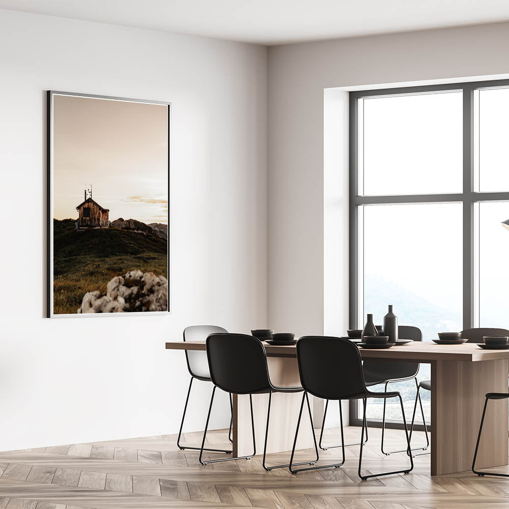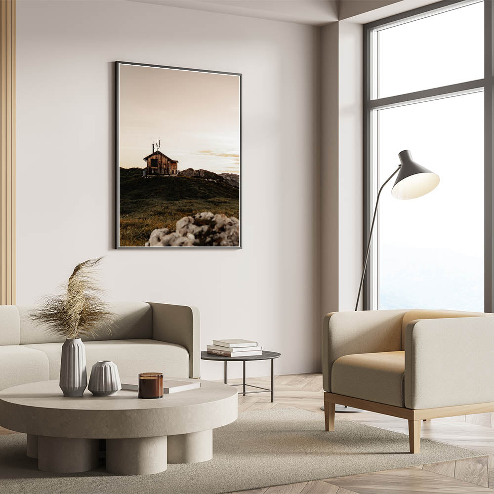 Capture the peaceful isolation of the wilderness with our "Mountain Cabin Serenity" wall art. This stunning artwork features a solitary wooden cabin perched atop a grassy hill, bathed in the soft, golden light of sunset. The rugged beauty of the distant mountains and the simplicity of the cabin create a sense of calm and reflection, perfect for anyone who cherishes the quiet solitude of nature.