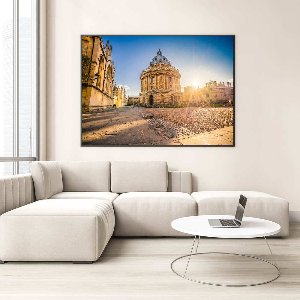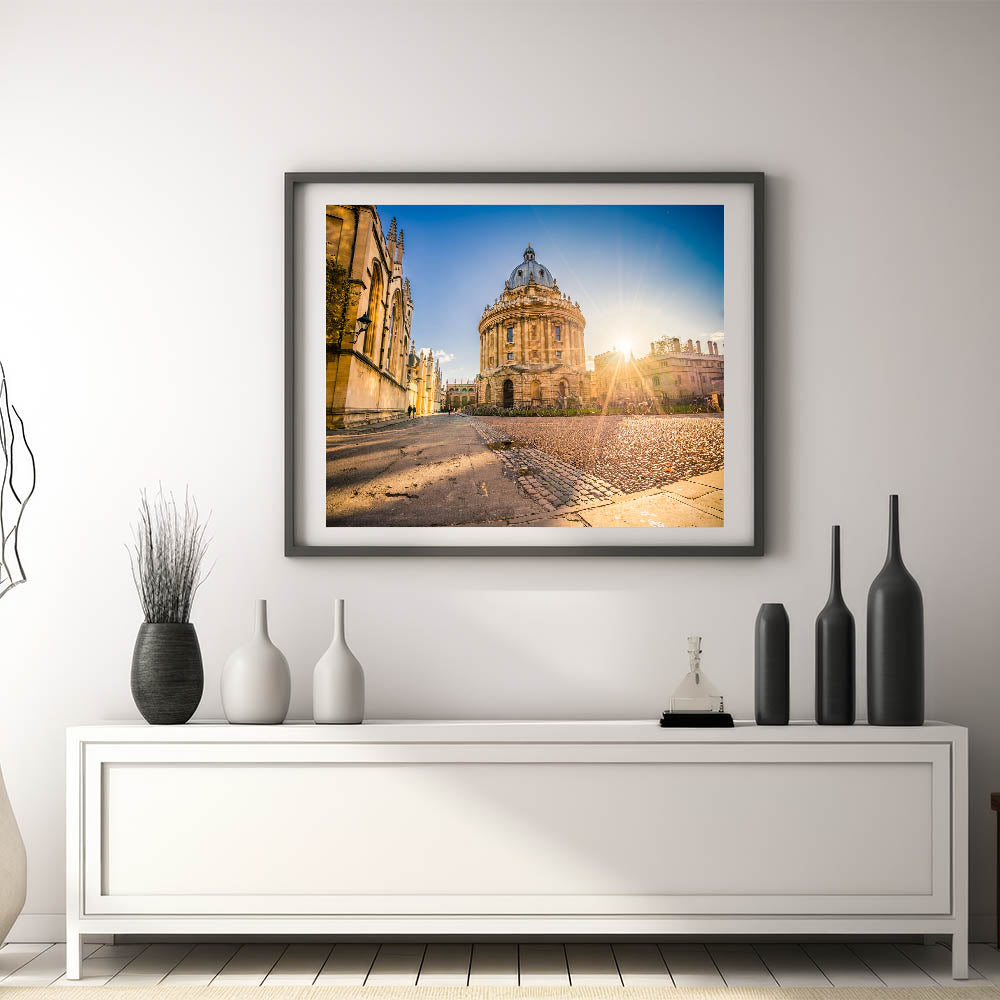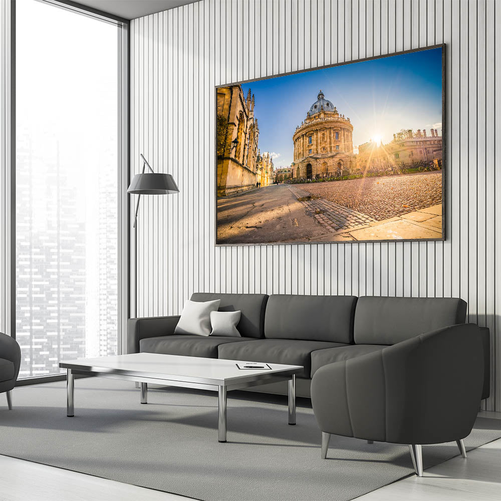 Experience the timeless elegance of Oxford with this captivating wall art, featuring a breathtaking sunrise over the historic Radcliffe Camera. As one of Oxford’s most iconic landmarks, this stunning image brings warmth and charm to any room. The soft morning light highlights the intricate details of the architecture, inviting viewers into a serene and inspiring moment in the heart of the city.
