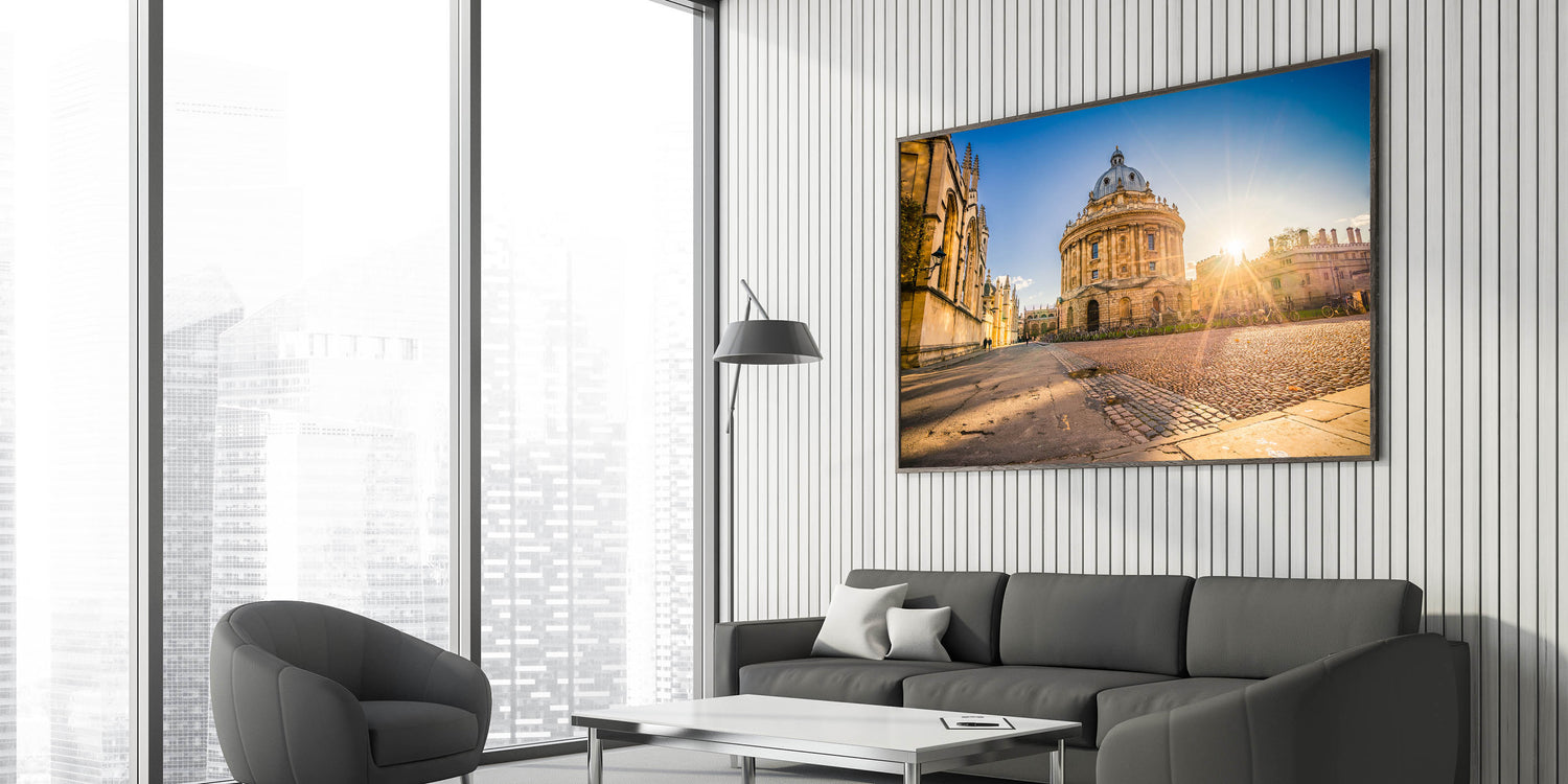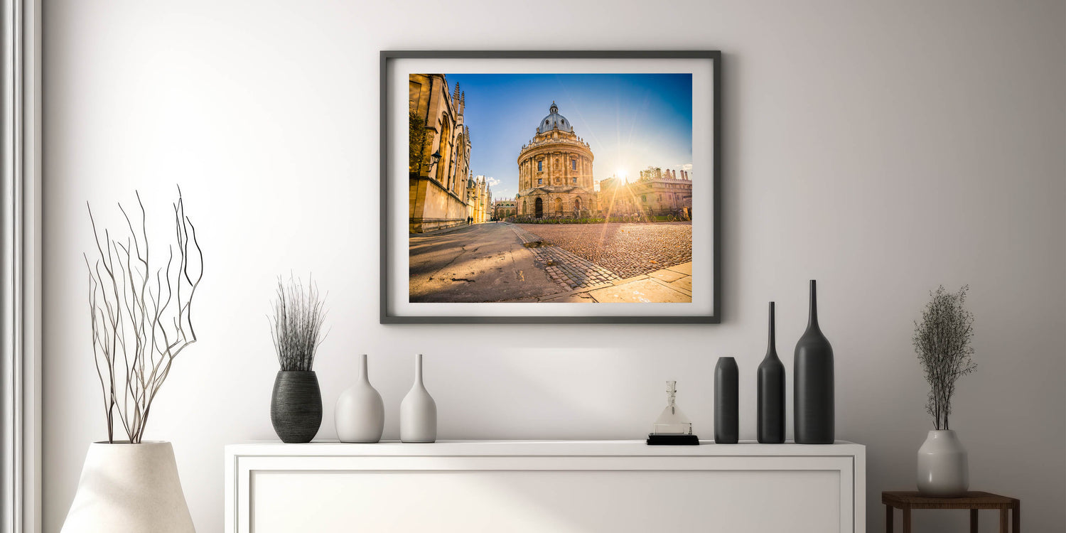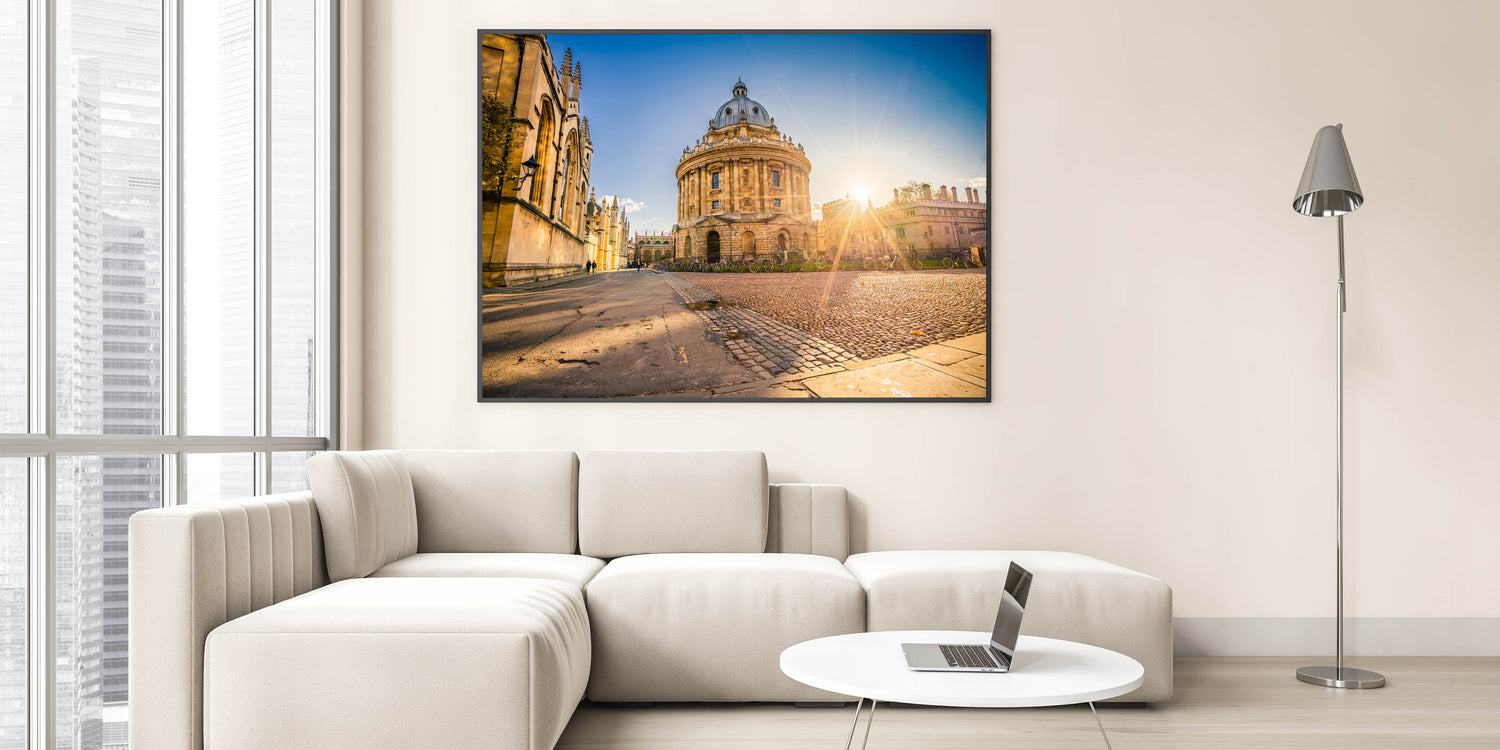 Experience the timeless elegance of Oxford with this captivating wall art, featuring a breathtaking sunrise over the historic Radcliffe Camera. As one of Oxford’s most iconic landmarks, this stunning image brings warmth and charm to any room. The soft morning light highlights the intricate details of the architecture, inviting viewers into a serene and inspiring moment in the heart of the city.