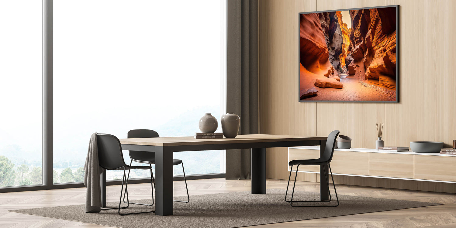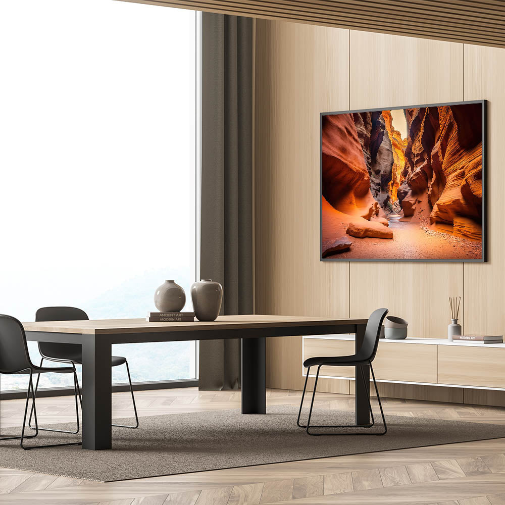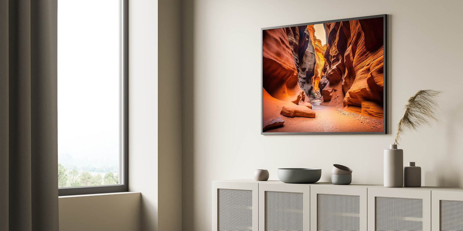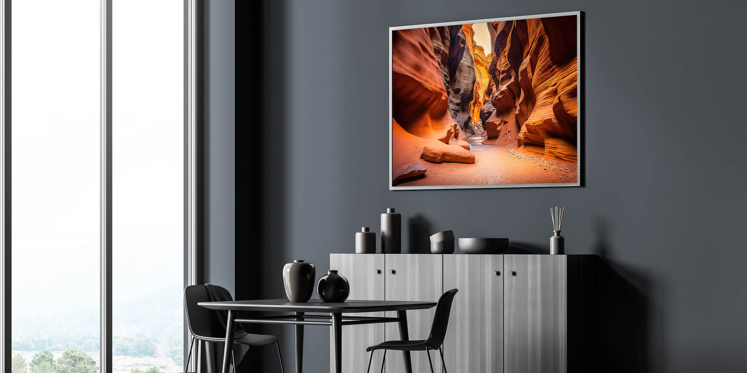 • Dramatic depiction of a canyon pathway that enhances any decor style
