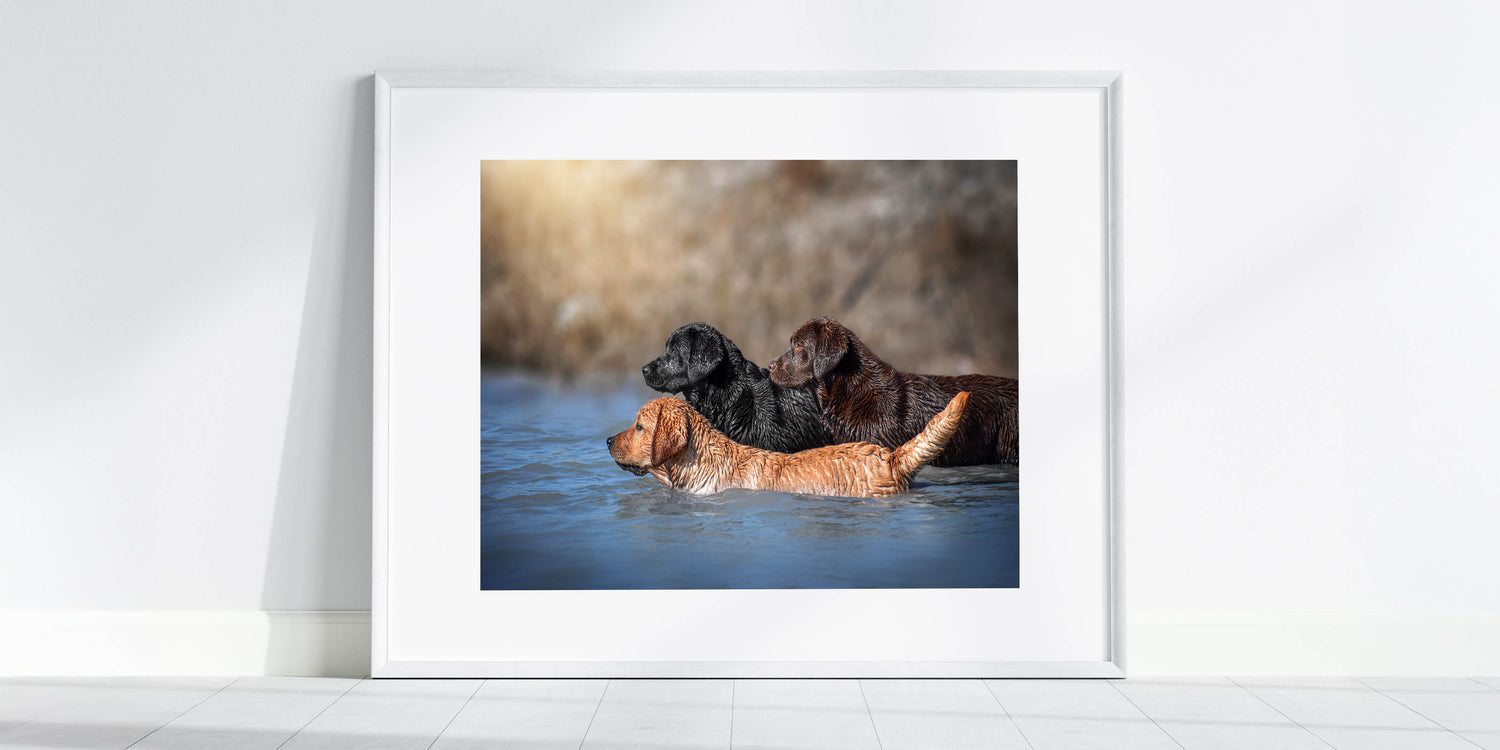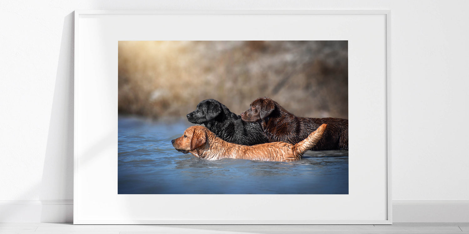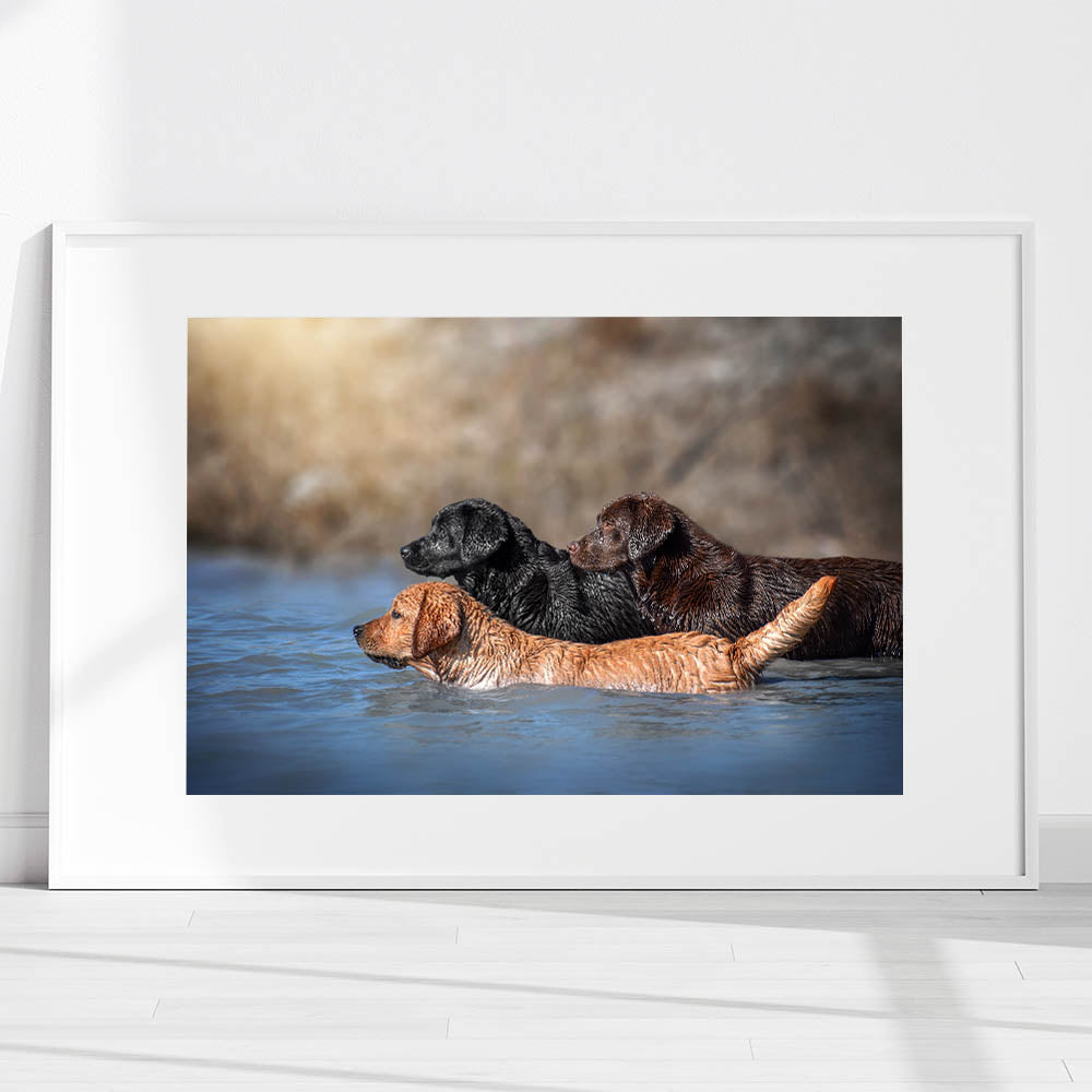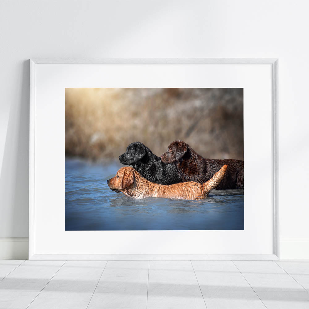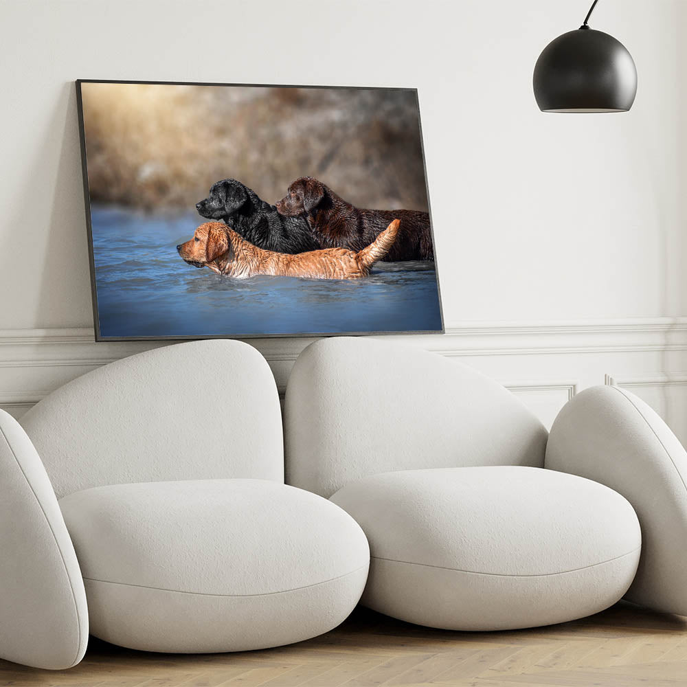 Add a touch of playful energy to your space with this vibrant wall art featuring three Labradors enjoying a swim. Part of our Animal Art Collection, this piece beautifully captures the joy and camaraderie of these beloved dogs in a natural water setting. Perfect for dog lovers and art enthusiasts, this artwork is available in multiple formats to suit any decor style.