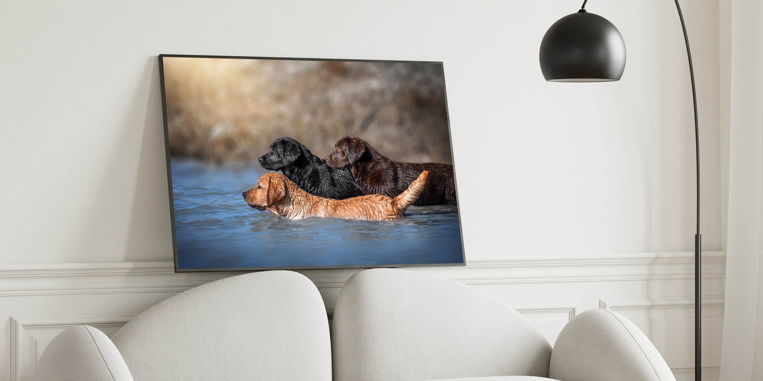 This modern dog art is not just a piece of decor but a statement of love for our playful canine companions. Whether you want to enhance your living room, bedroom, or office space, this Labradors in water wall decor is a perfect choice. Embrace the beauty of animal art with this lively piece that combines fine art and the love for pets seamlessly.