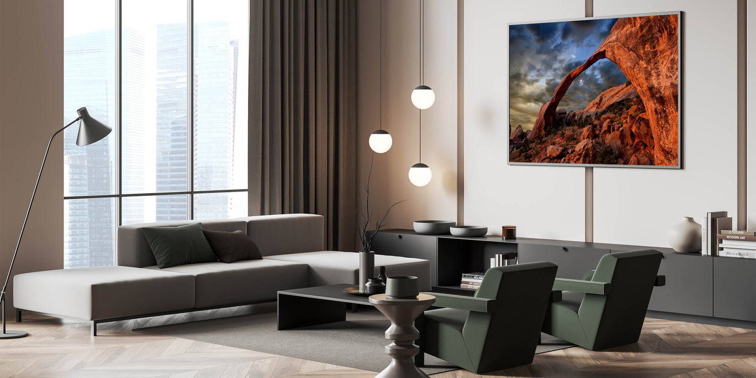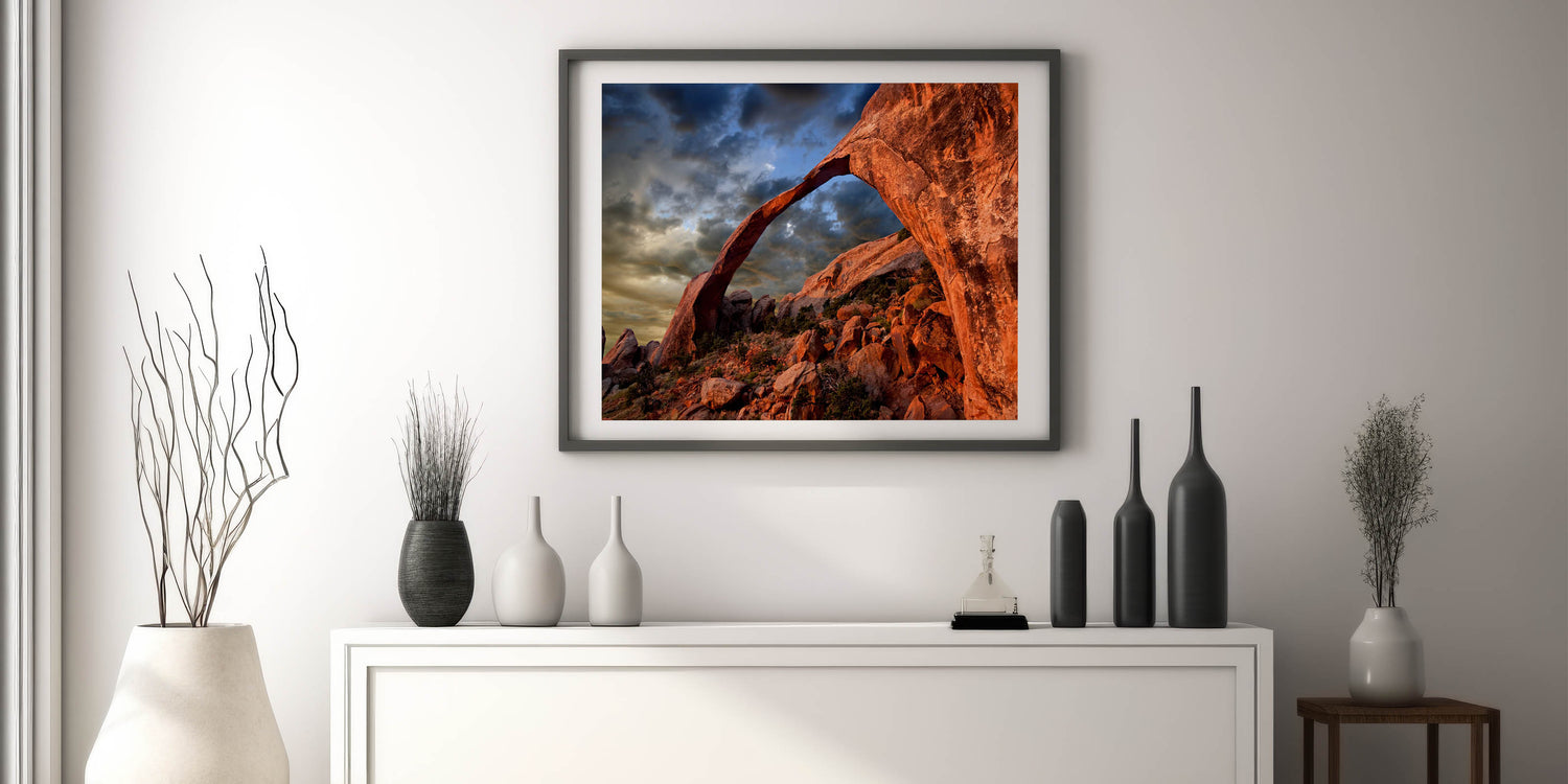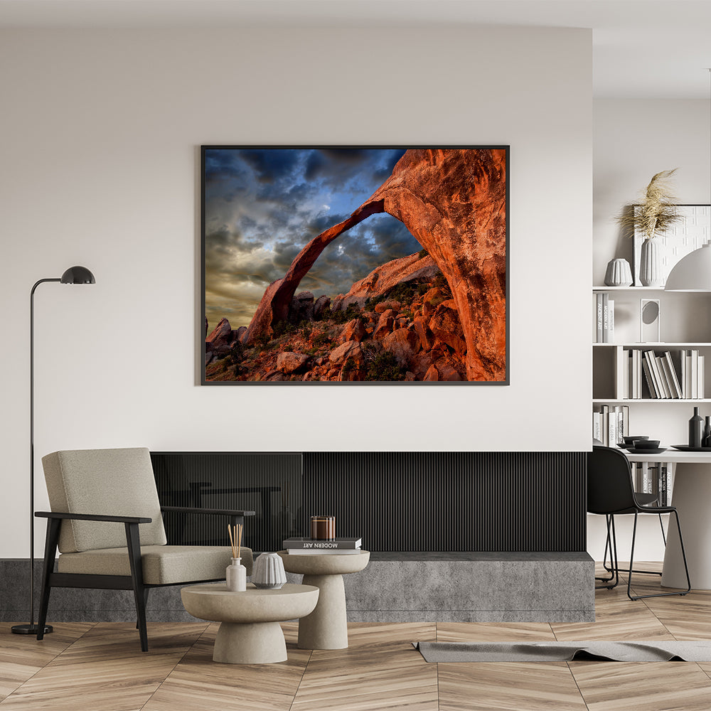 Transform your space with this powerful piece that celebrates the majestic landscapes of the desert. Whether displayed as a canvas print or in a sleek acrylic glass frame, this artwork is designed to impress and inspire. Let the beauty of the red rock arch add a bold, natural element to your decor.