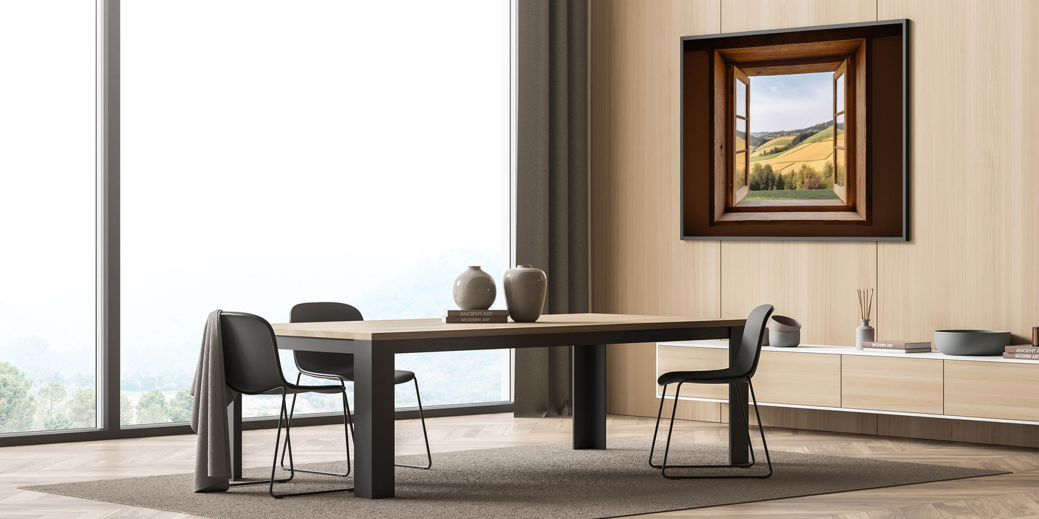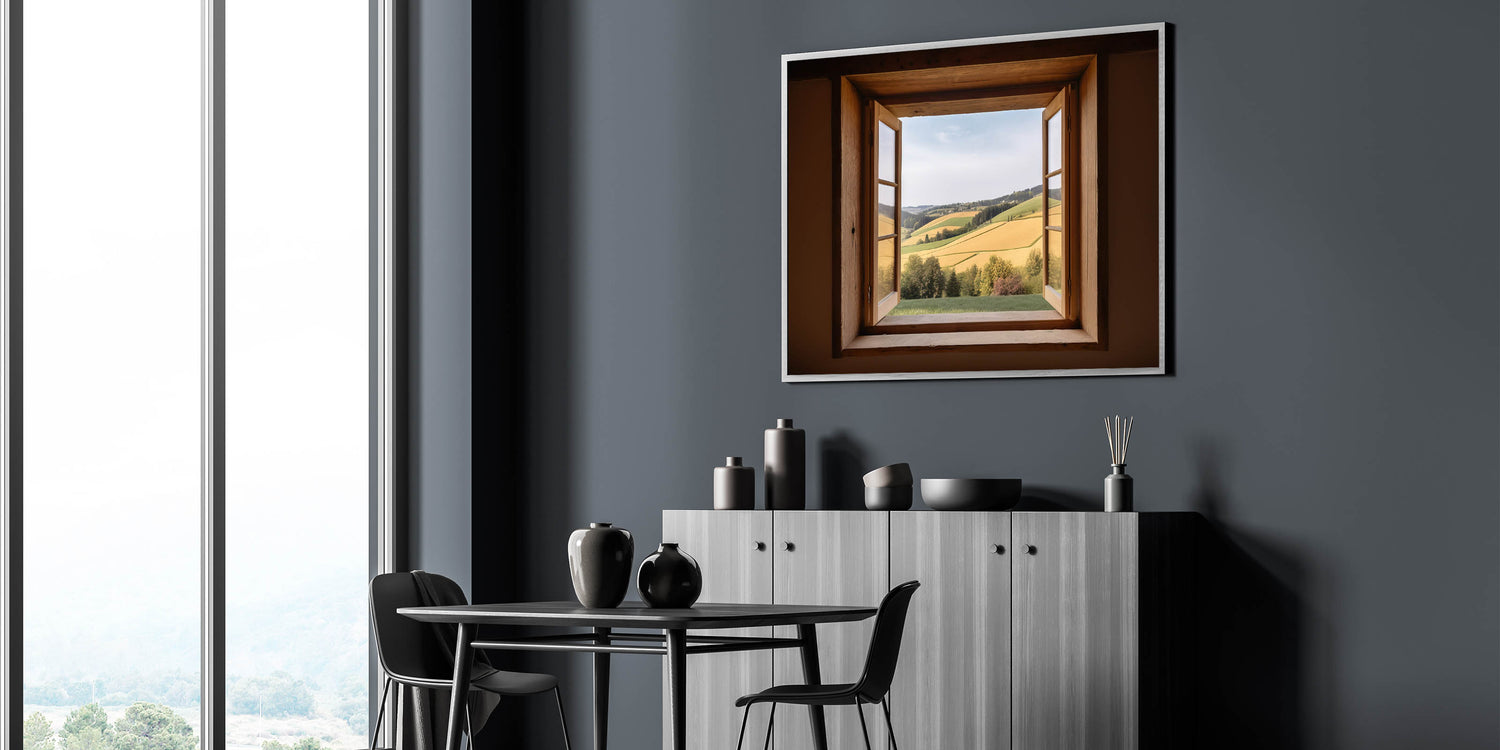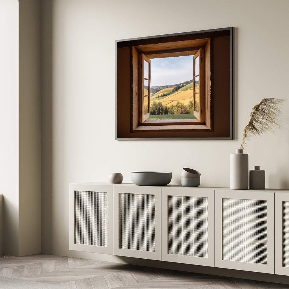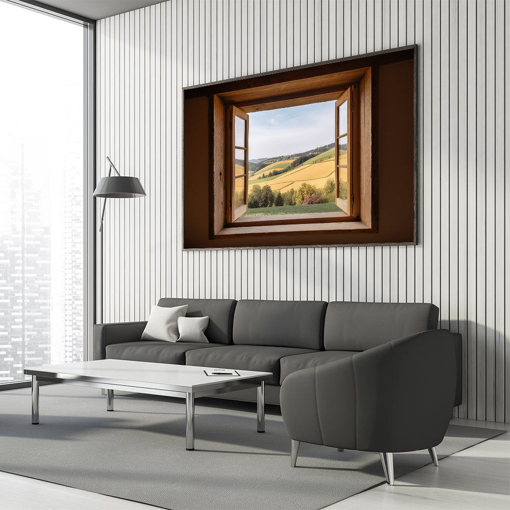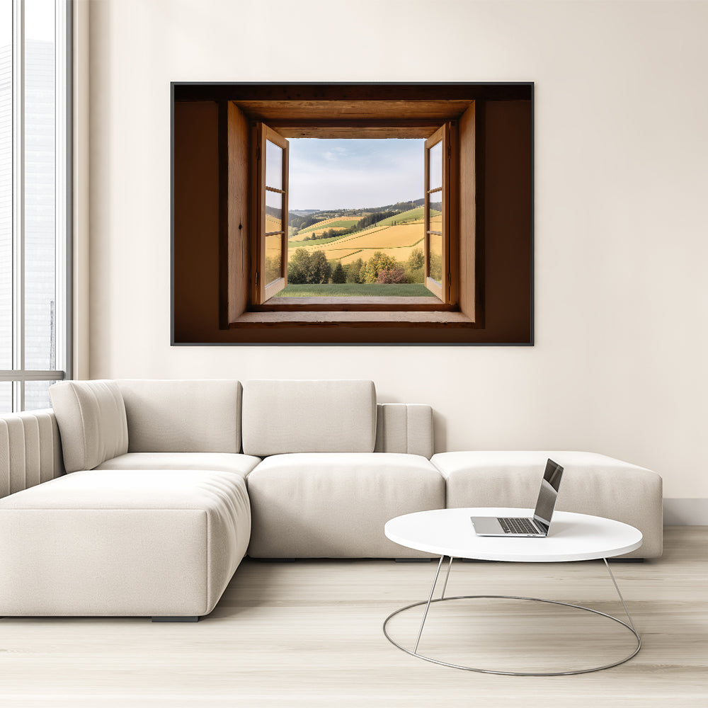 This window canvas art is perfect for those who love the simplicity and beauty of rural landscapes. Whether you're looking to create a calming atmosphere in your living room or add a touch of nature to your office, this unique urban window decor piece will make a lasting impression. Bring the peaceful charm of the countryside into your space with this elegant window artwork.