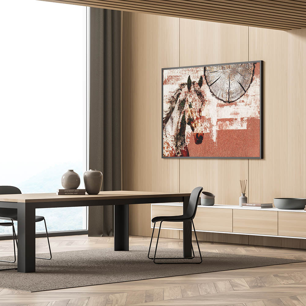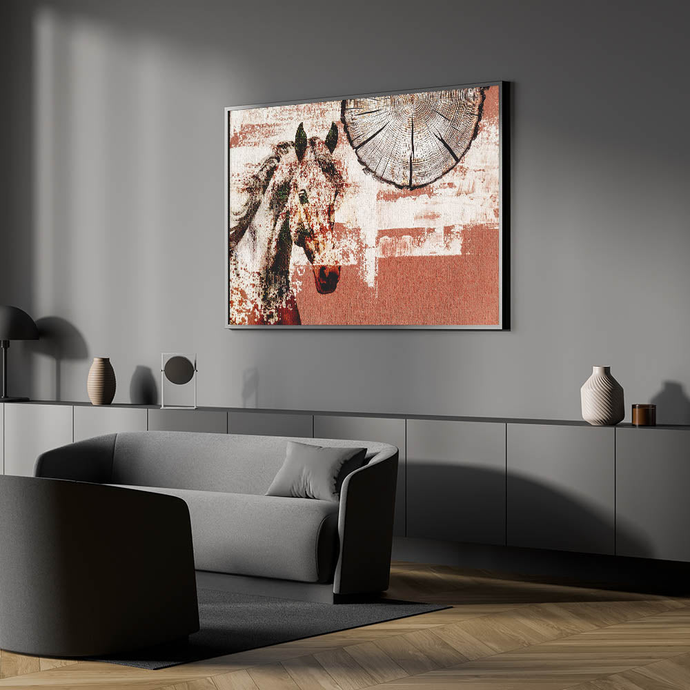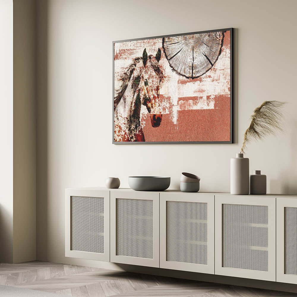 Capture the spirit of the wild west with this rustic horse and woodgrain art. The design features a beautifully rendered horse, set against a textured background that highlights the intricate patterns of woodgrain. The combination of the natural elements with the bold portrayal of the horse creates a powerful visual that is perfect for adding a touch of rugged charm to any space.