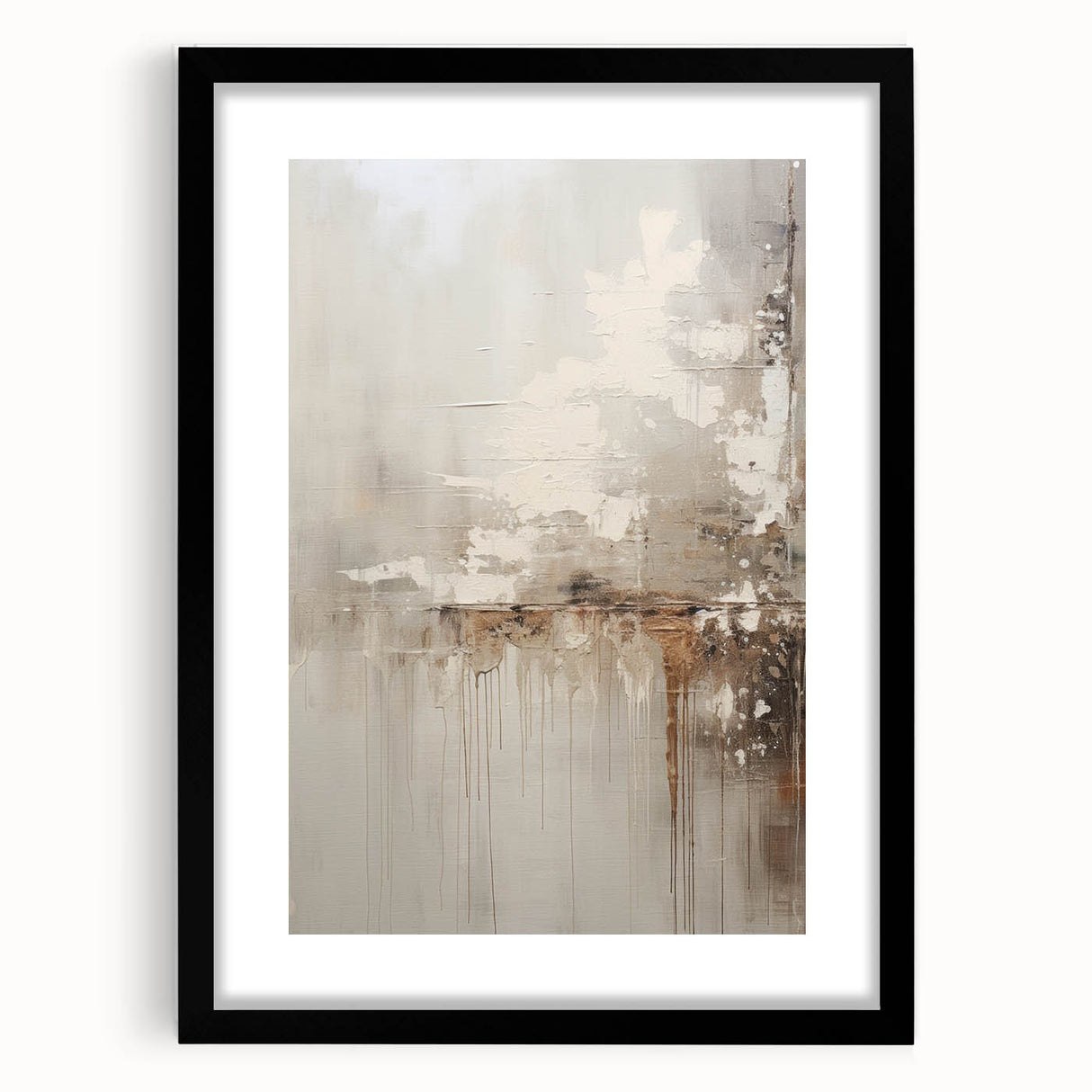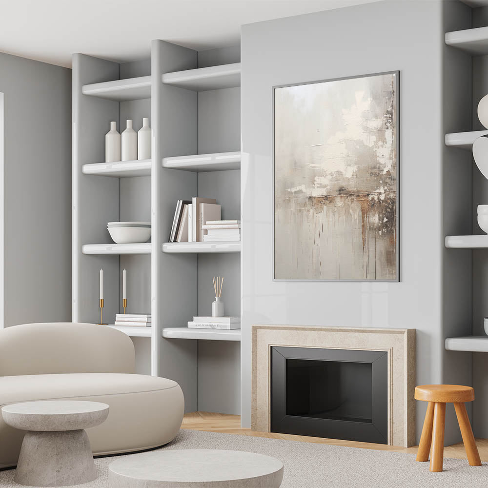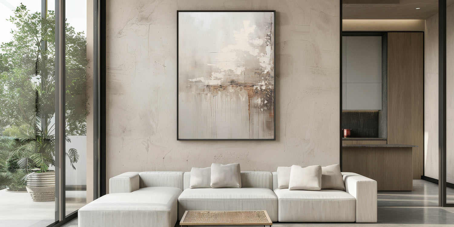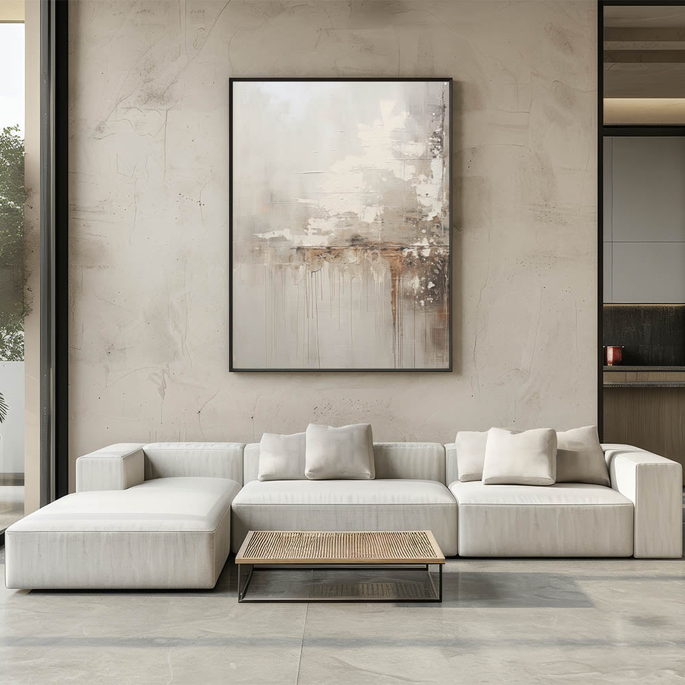 Transform your living space with this rustic modern abstract wall art, featuring a textured minimalist design that blends earthy tones with subtle contrasts. The artwork showcases a combination of soft beige, warm browns, and muted grays, with organic drips and layers that add depth and intrigue. The rustic textures and neutral palette make it a versatile piece, perfect for creating a cozy yet contemporary atmosphere in any room.