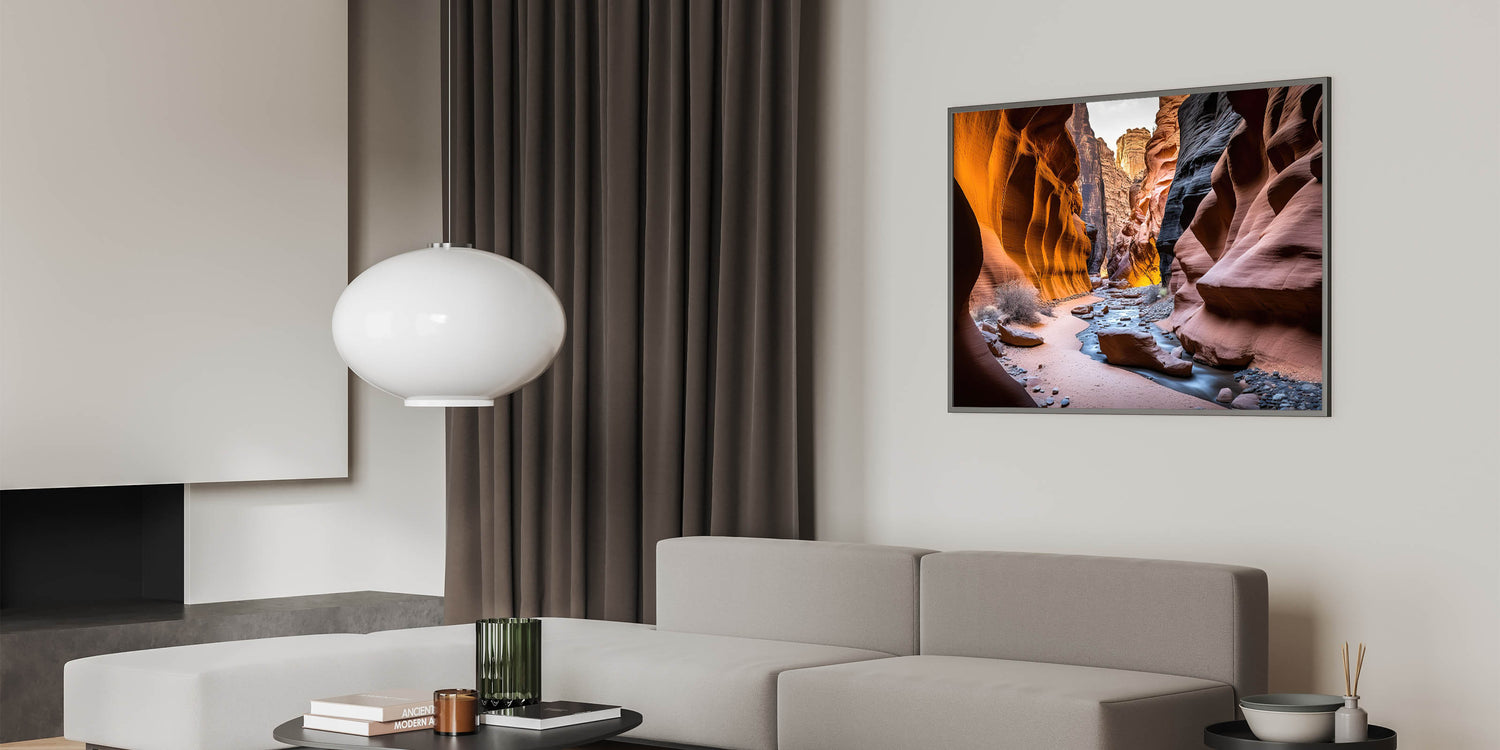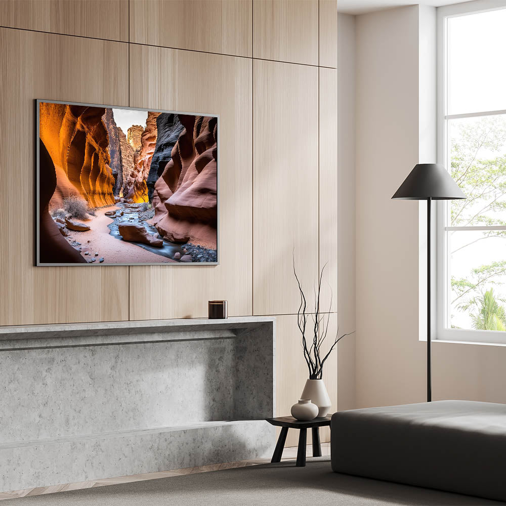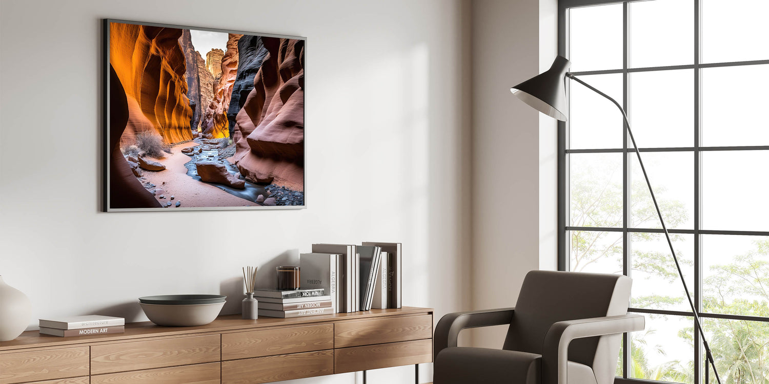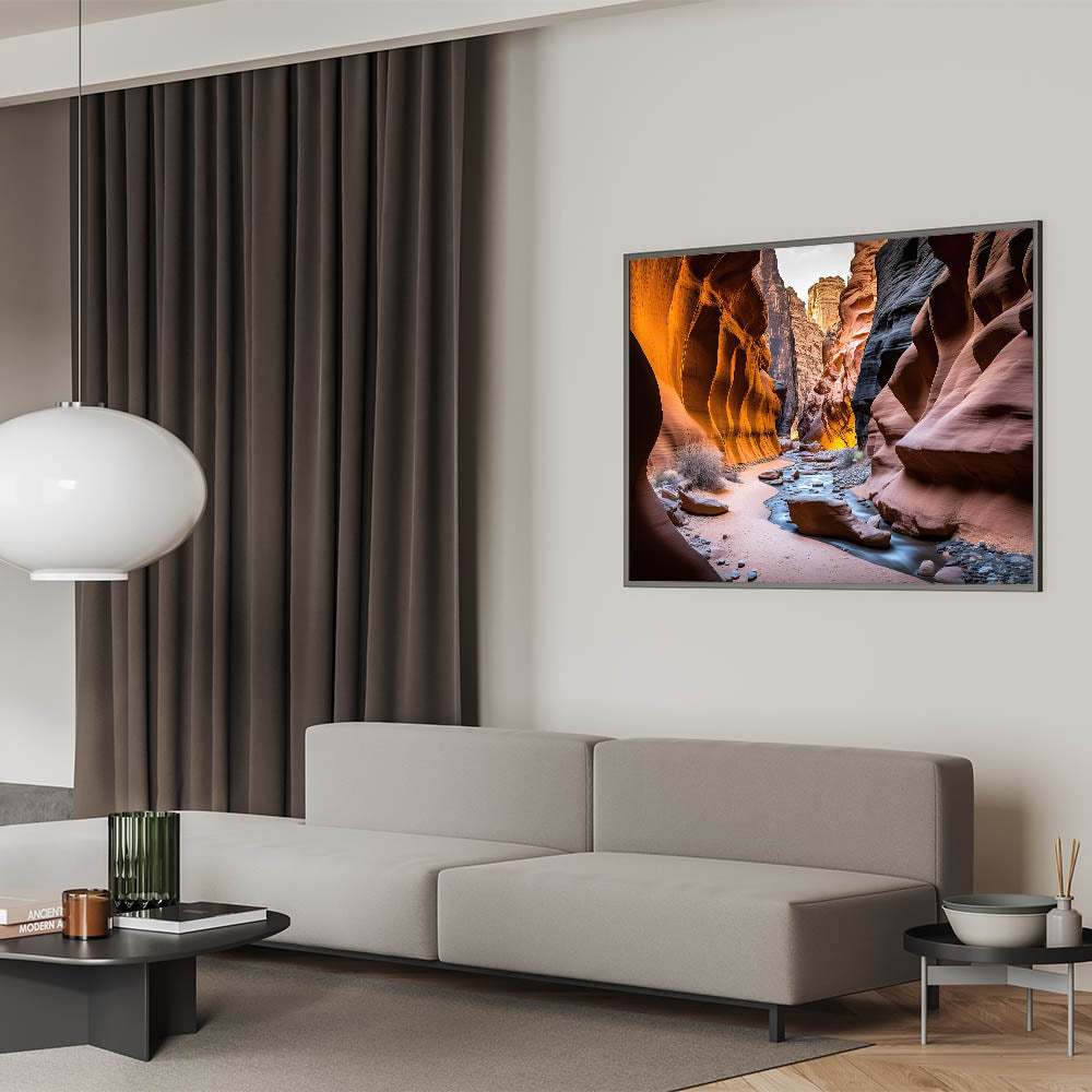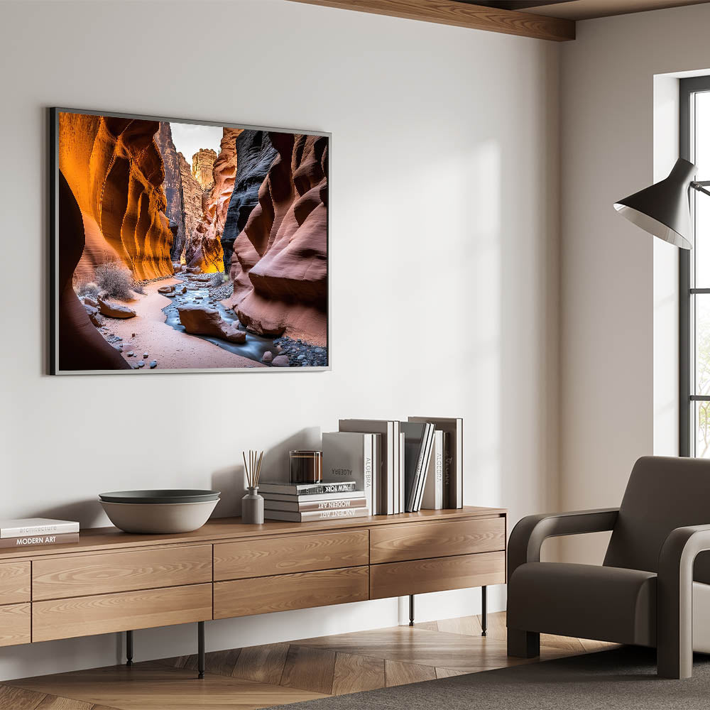 Experience the tranquil beauty of nature with our serene canyon stream wall art. This breathtaking piece captures the peaceful flow of a stream winding through a narrow canyon, with the warm hues of the rock walls reflecting the gentle light. The contrast between the soft water and the rugged textures of the canyon creates a harmonious and calming effect, making this artwork a perfect addition to any space seeking a touch of serenity.