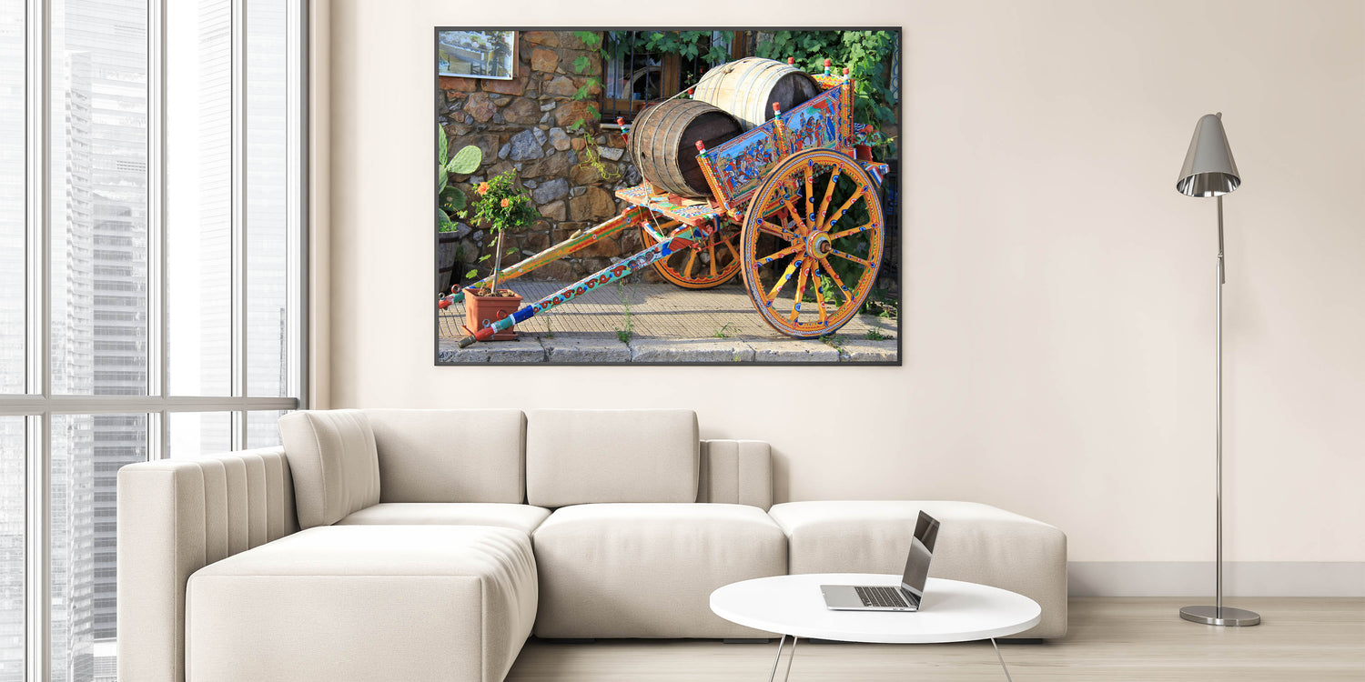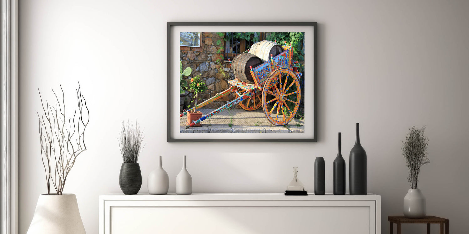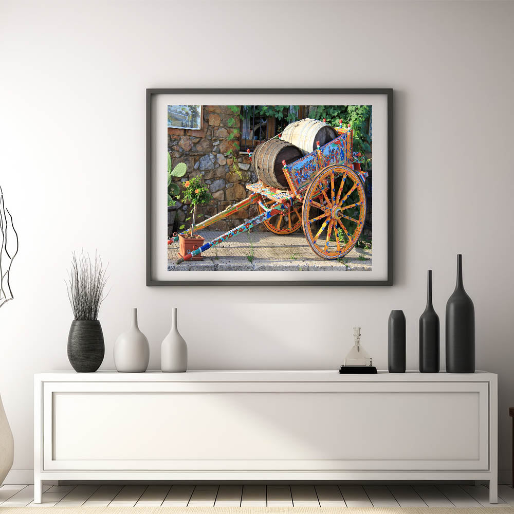 Celebrate the vibrant culture of Sicily with this stunning Sicily photography art featuring a traditional painted cart. The intricate details of the hand-painted wooden cart, adorned with historical scenes and vibrant colors, highlight Sicily’s deep-rooted traditions and craftsmanship. Set against a rustic stone wall, this piece embodies the charm and history of rural Sicilian life, making it a perfect addition to any art collection.