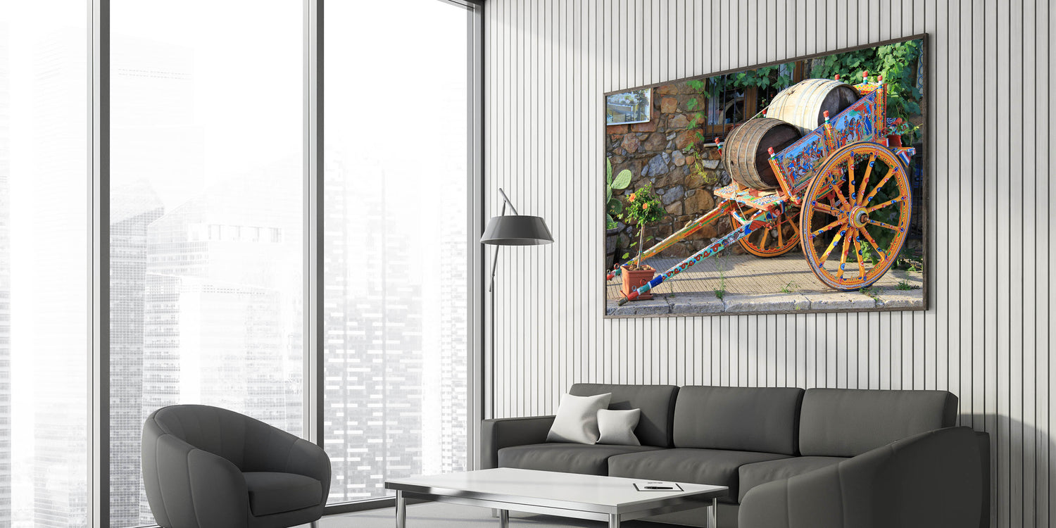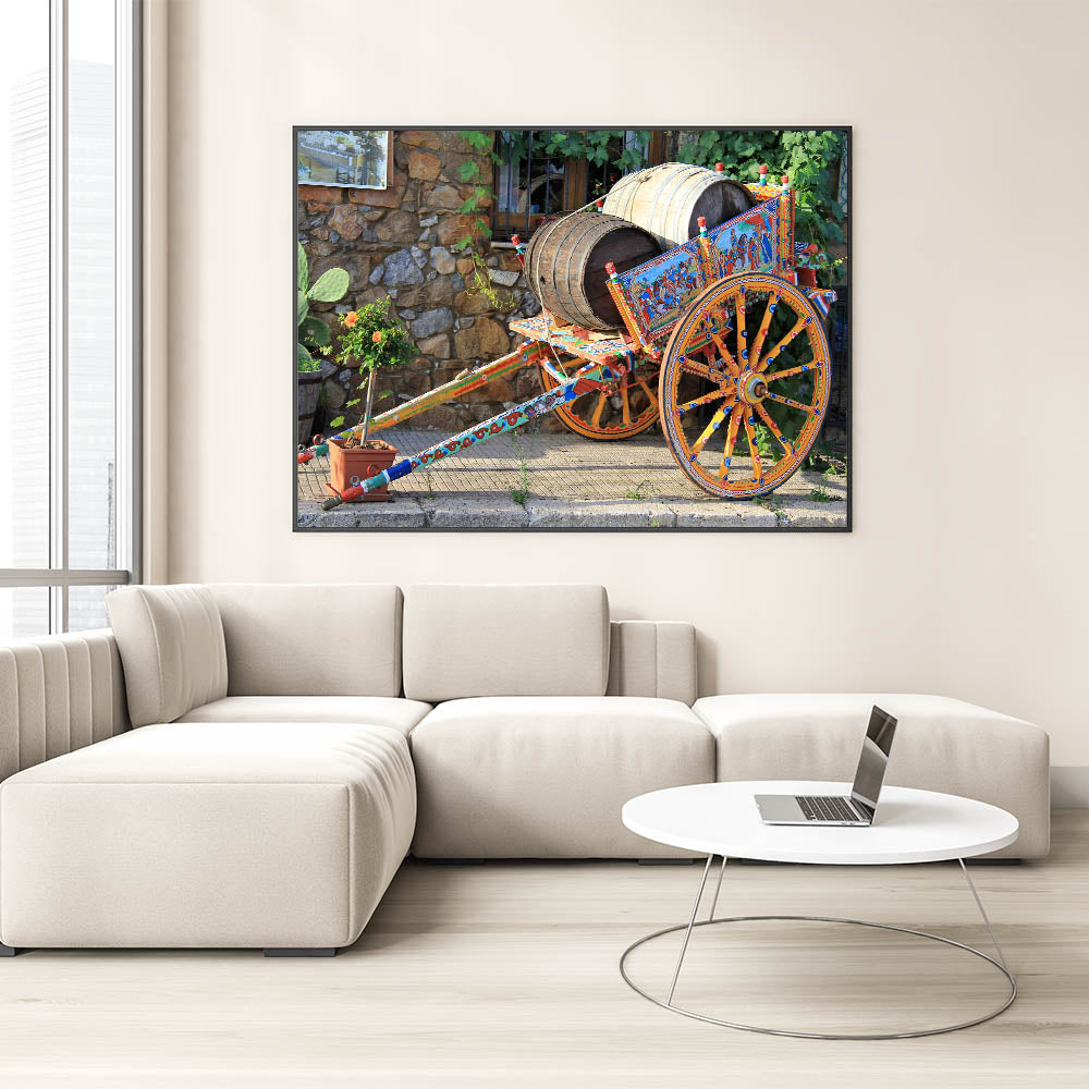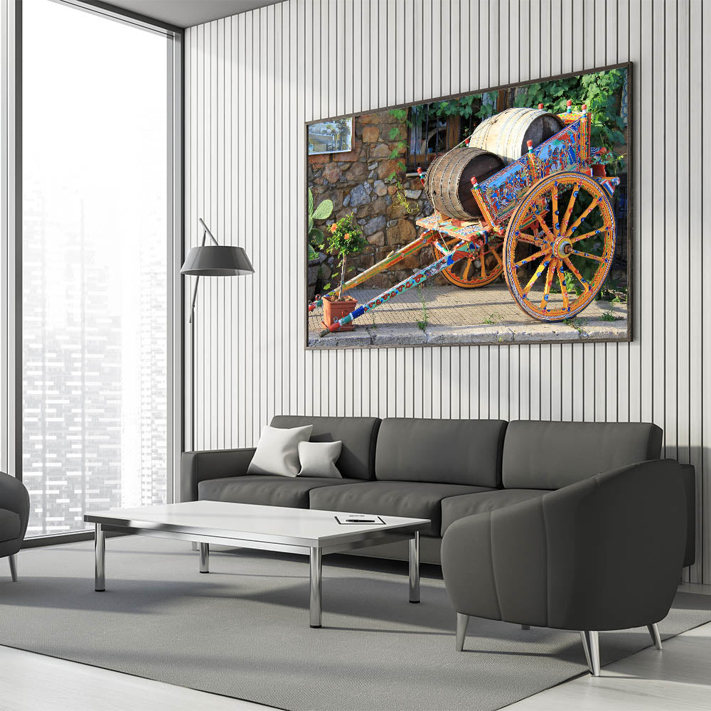 Celebrate the vibrant culture of Sicily with this stunning Sicily photography art featuring a traditional painted cart. The intricate details of the hand-painted wooden cart, adorned with historical scenes and vibrant colors, highlight Sicily’s deep-rooted traditions and craftsmanship. Set against a rustic stone wall, this piece embodies the charm and history of rural Sicilian life, making it a perfect addition to any art collection.