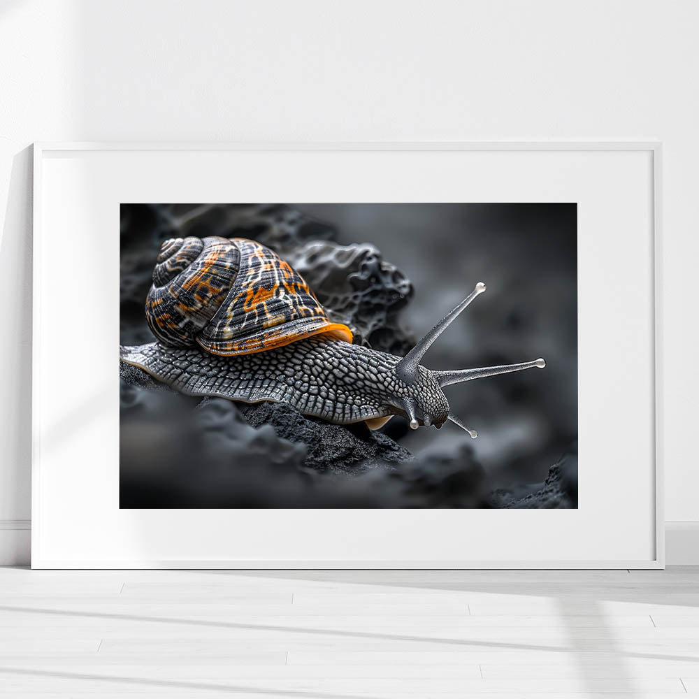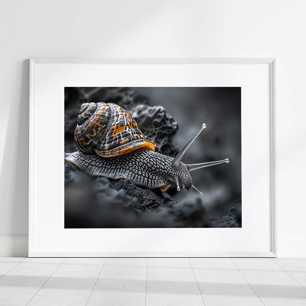 - Vivid Colors: The artwork showcases rich tones of black, gray, and orange, bringing the snail’s natural habitat to life.
