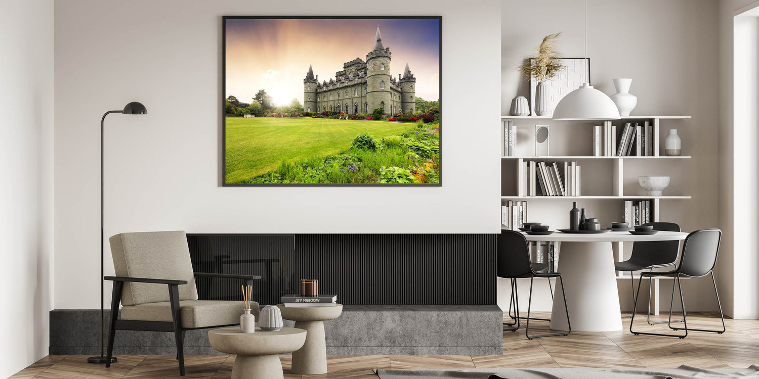 Illuminate your space with the serene beauty of this sunlit castle wall art. This stunning print captures a grand European castle, bathed in the soft, golden light of the setting sun. The lush green gardens and vibrant flowers in the foreground add a burst of color, making this piece a perfect blend of nature and historic architecture. Ideal for adding a touch of elegance and warmth to any room, this artwork transports you to a peaceful and majestic setting.