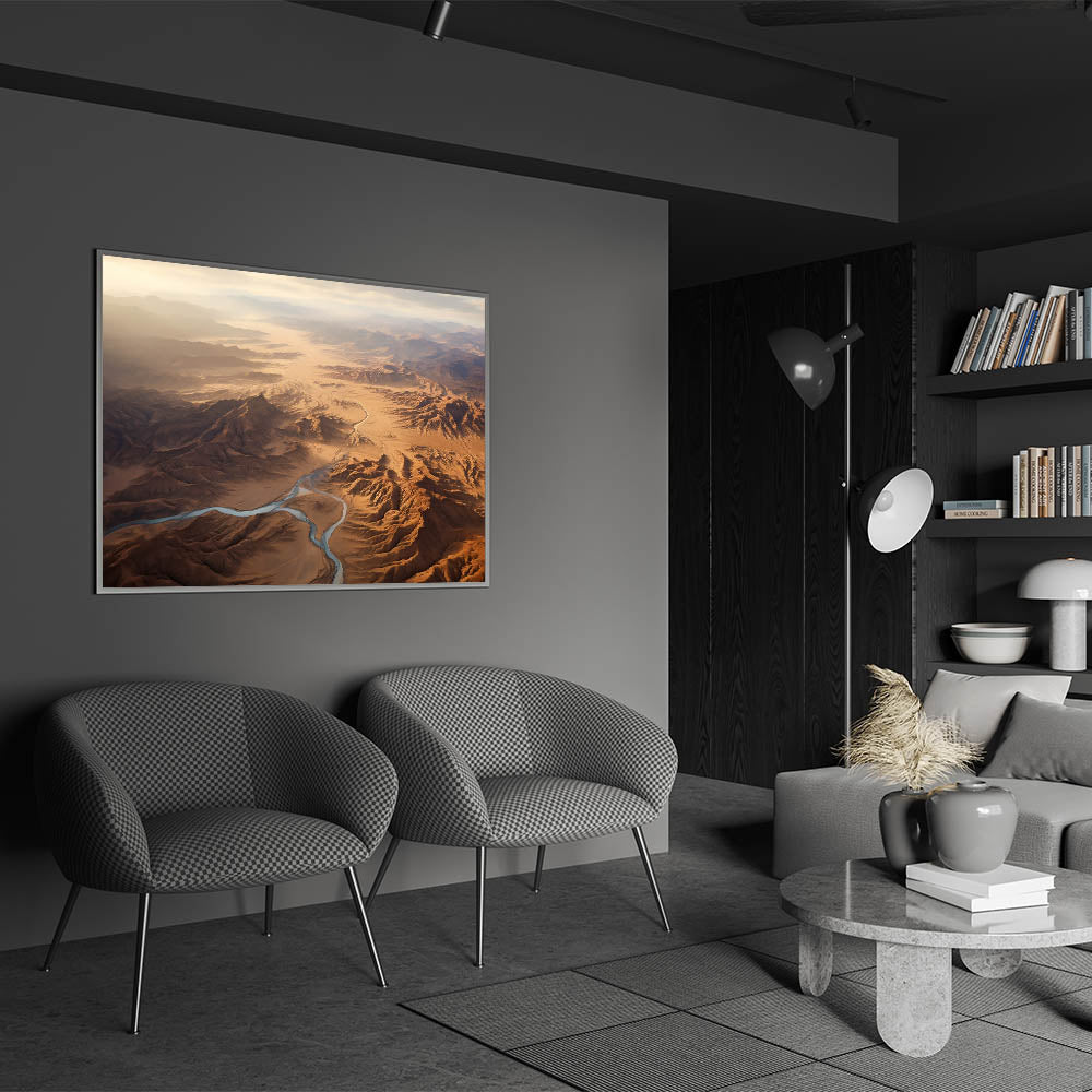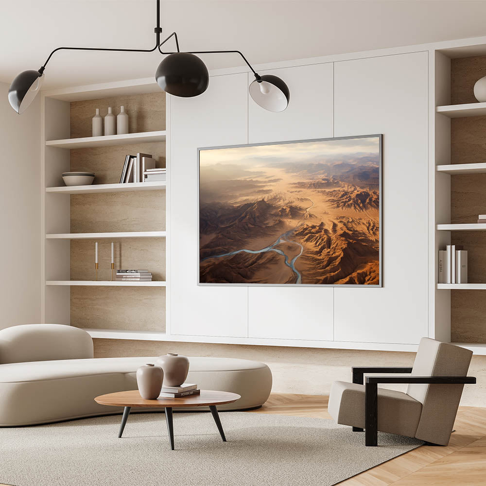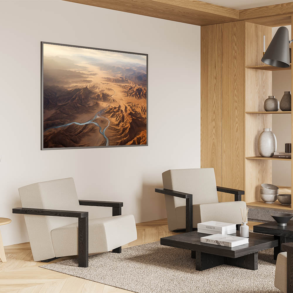 Immerse yourself in the awe-inspiring grandeur of the desert with this stunning aerial view wall art. This artwork captures the expansive beauty of a desert landscape, with winding rivers cutting through rugged mountains and endless stretches of sand. The soft light of the early morning sun bathes the scene in a warm, golden glow, creating a breathtaking view that evokes a sense of wonder and tranquility.