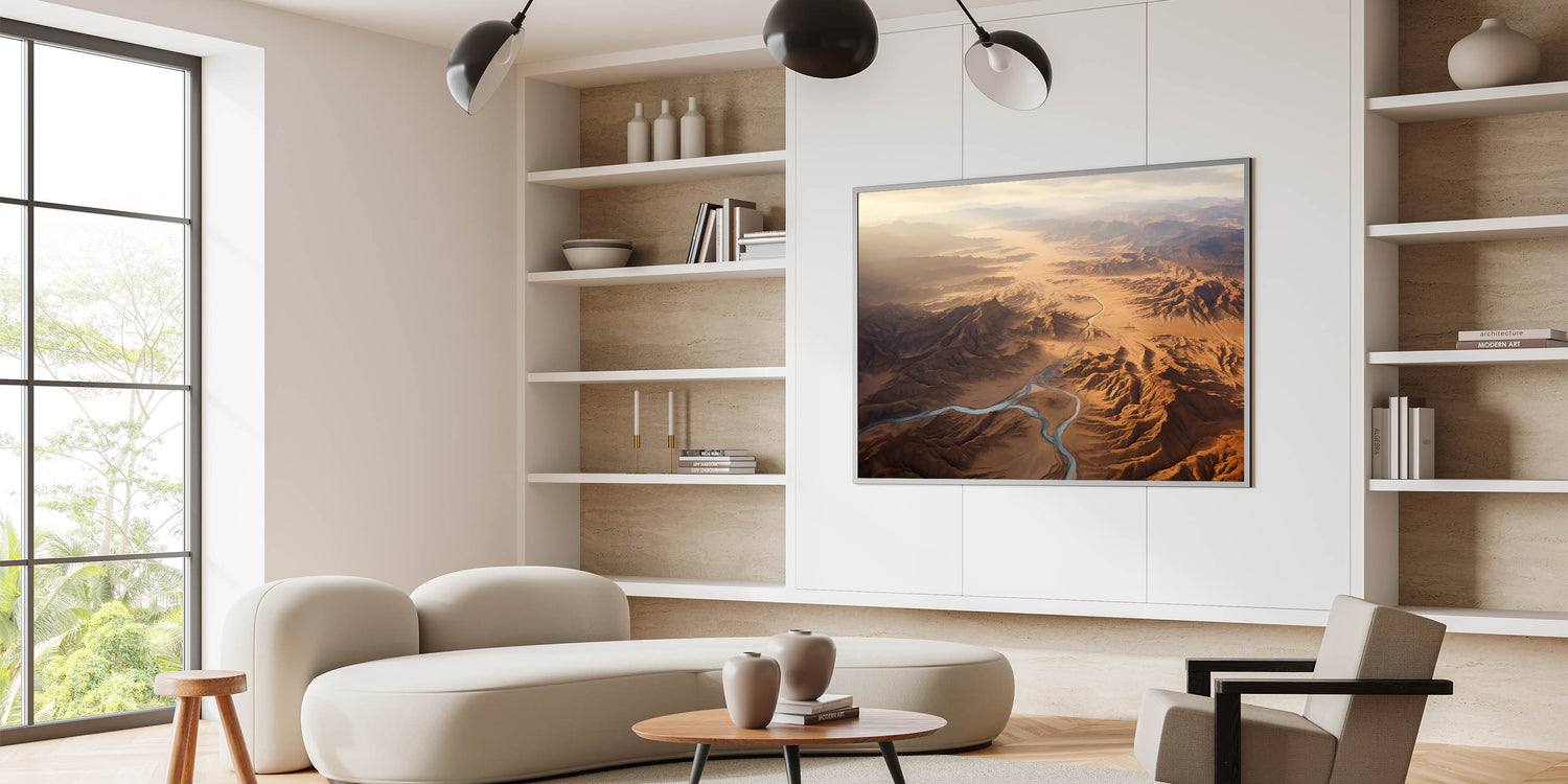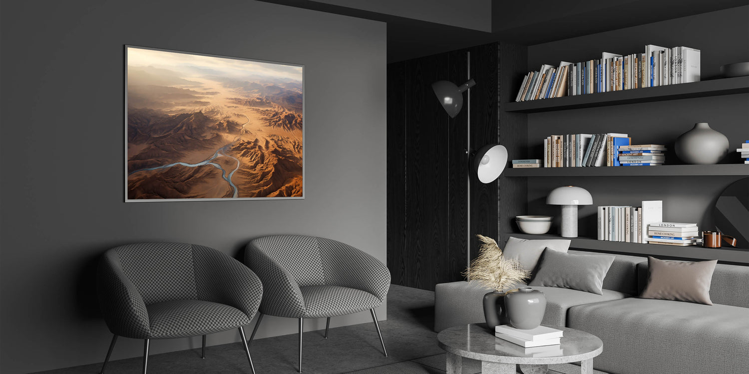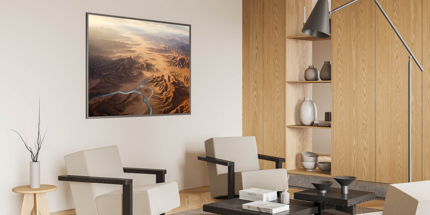 Immerse yourself in the awe-inspiring grandeur of the desert with this stunning aerial view wall art. This artwork captures the expansive beauty of a desert landscape, with winding rivers cutting through rugged mountains and endless stretches of sand. The soft light of the early morning sun bathes the scene in a warm, golden glow, creating a breathtaking view that evokes a sense of wonder and tranquility.
