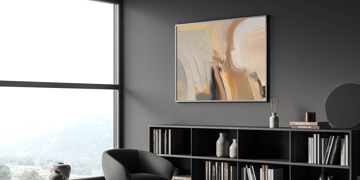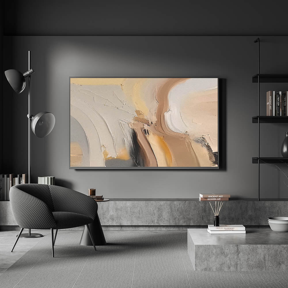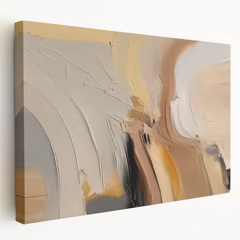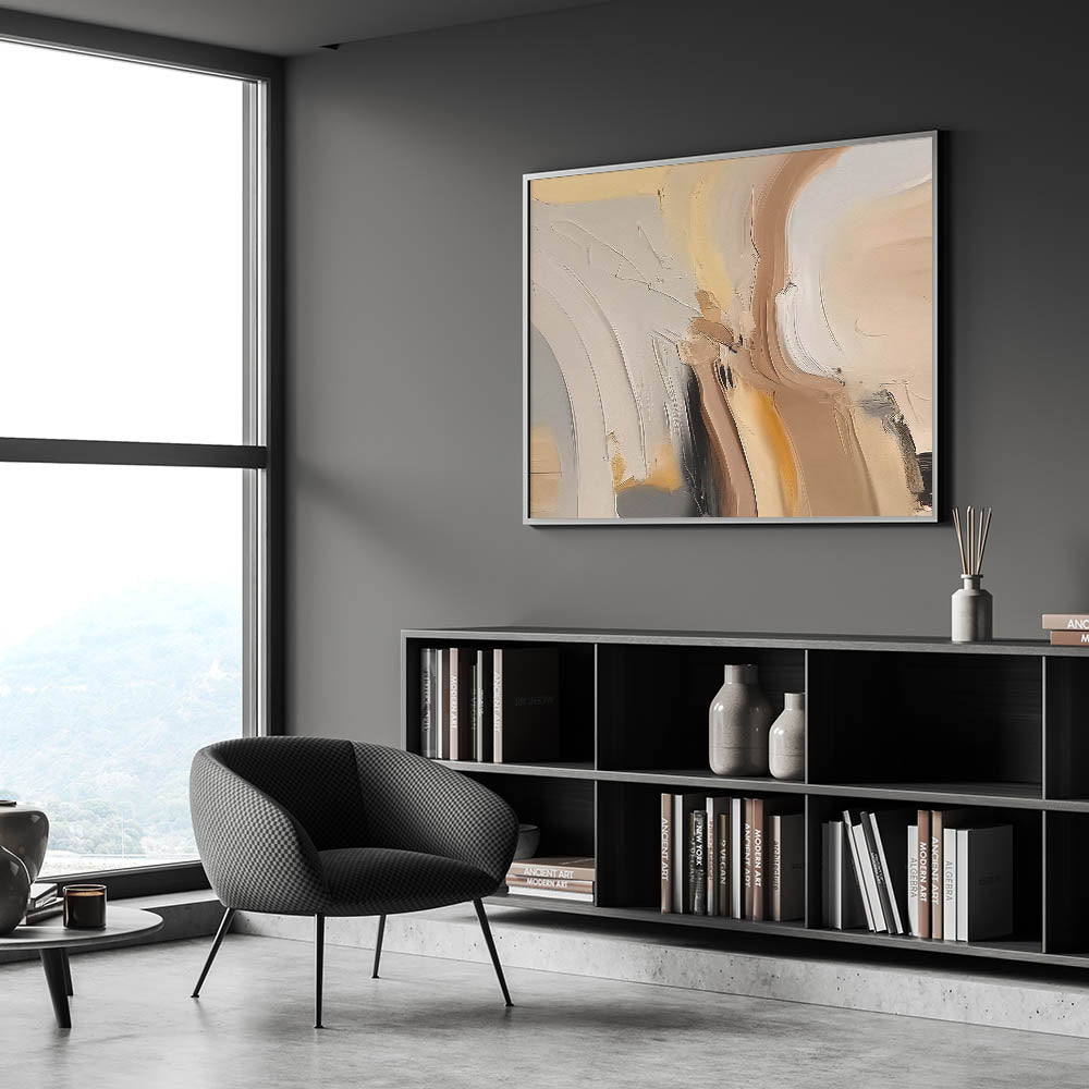 Bring warmth and sophistication to your space with this contemporary abstract strokes design. The artwork features a beautiful blend of warm neutral tones, including soft beiges, tans, and subtle hints of black, creating a soothing and inviting atmosphere. The dynamic brushstrokes and elegant curves give this piece a unique character that perfectly complements modern and minimalist interiors.