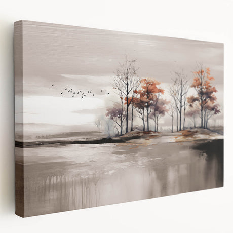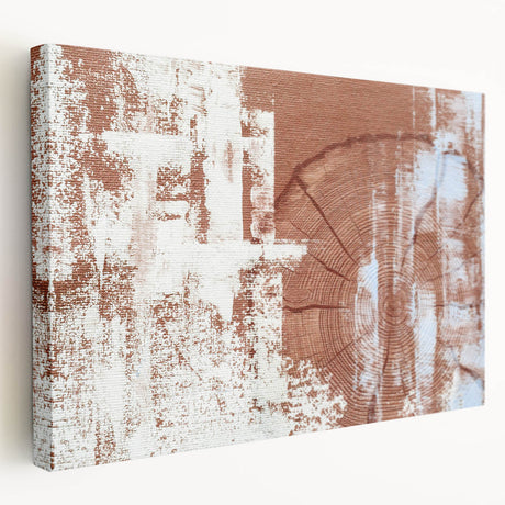 • Stretched canvas artwork showcasing an abstract minimalist design with soft earthy tones, side view highlighting its depth and texture, perfect for modern decor.