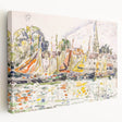 Add a splash of vibrant energy to your space with this dynamic modern wall art inspired by Paul Signac's "Le Pouliguen Fishing Boats." This captivating piece features colorful boats, playful reflections on the water, and an intricate backdrop of a charming coastal town. The bold brushstrokes and lively palette bring movement and vitality, making this artwork a perfect addition to trendy home decor.