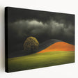 Experience the powerful contrast of light and shadow with this Tree Art Print, featuring a solitary tree set against rolling hills and an intense stormy sky. The striking blend of dark clouds, golden-orange fields, and lush green grass creates a captivating and moody atmosphere, making this Nature-Inspired Wall Art a perfect choice for those who appreciate dramatic landscapes.
