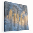 Embrace the breathtaking beauty of winter with this Tree Art Print, featuring tall golden-lit trees standing against a dramatic snow-covered mountain backdrop. The warm glow of sunlight filtering through the mist creates a stunning contrast between icy blues and golden tones, making this Nature-Inspired Wall Art a mesmerizing addition to any space. The delicate balance of light and shadow adds depth and elegance to this artwork, making it a perfect statement piece for lovers of scenic landscapes.