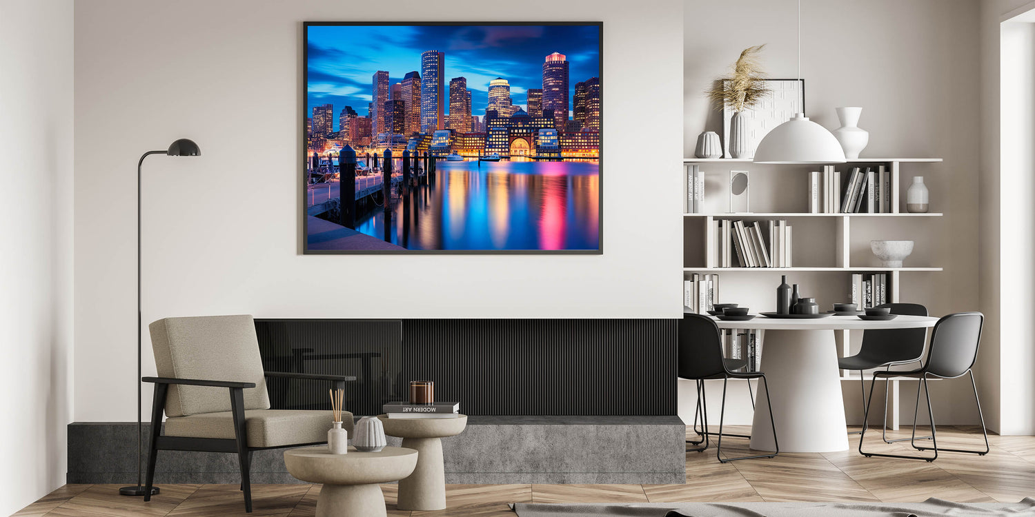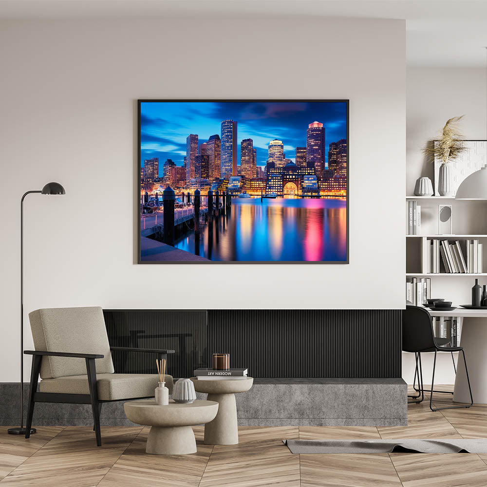 This vibrant Boston Wall Art captures the stunning Boston skyline as it reflects off the serene waterfront at night. The city’s iconic buildings are illuminated, creating a mesmerizing contrast with the deep blue sky and the colorful reflections on the water. This piece is part of our Boston Wall Art Collection and is available in multiple formats, including Boston Canvas Prints and framed options. Perfect for adding a dynamic, urban vibe to any living space or office, this artwork beautifully showcases the energy of the city.