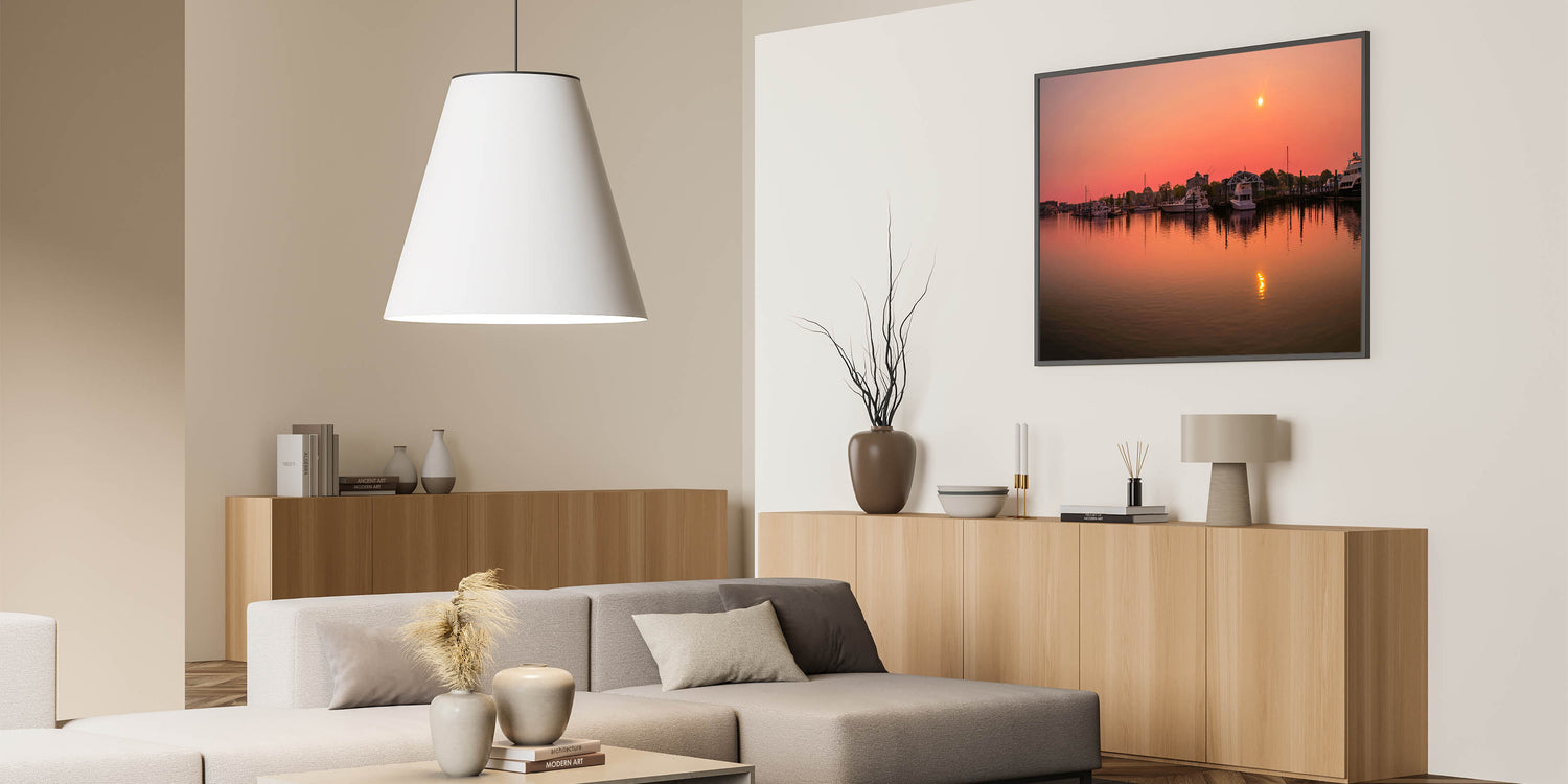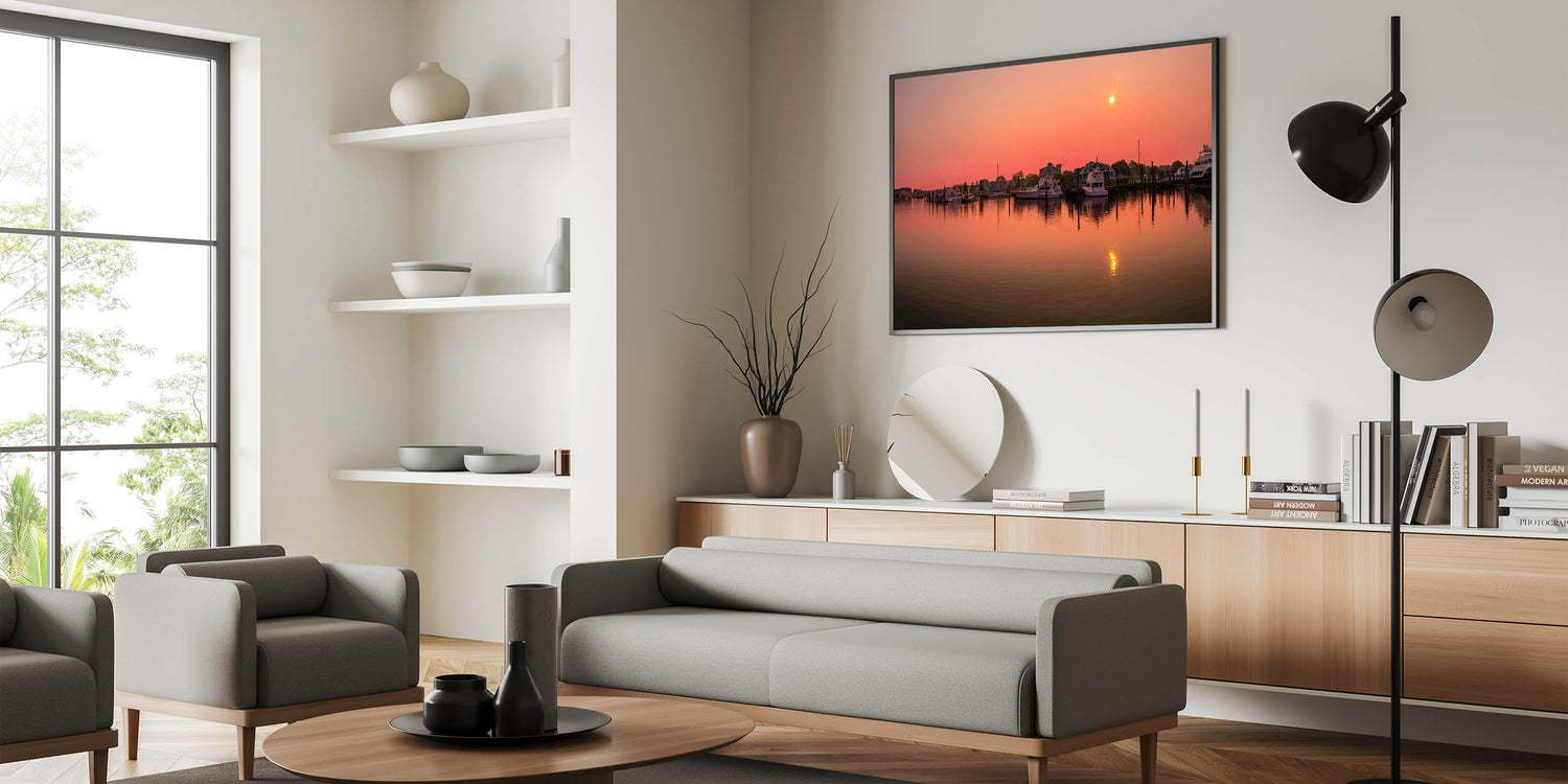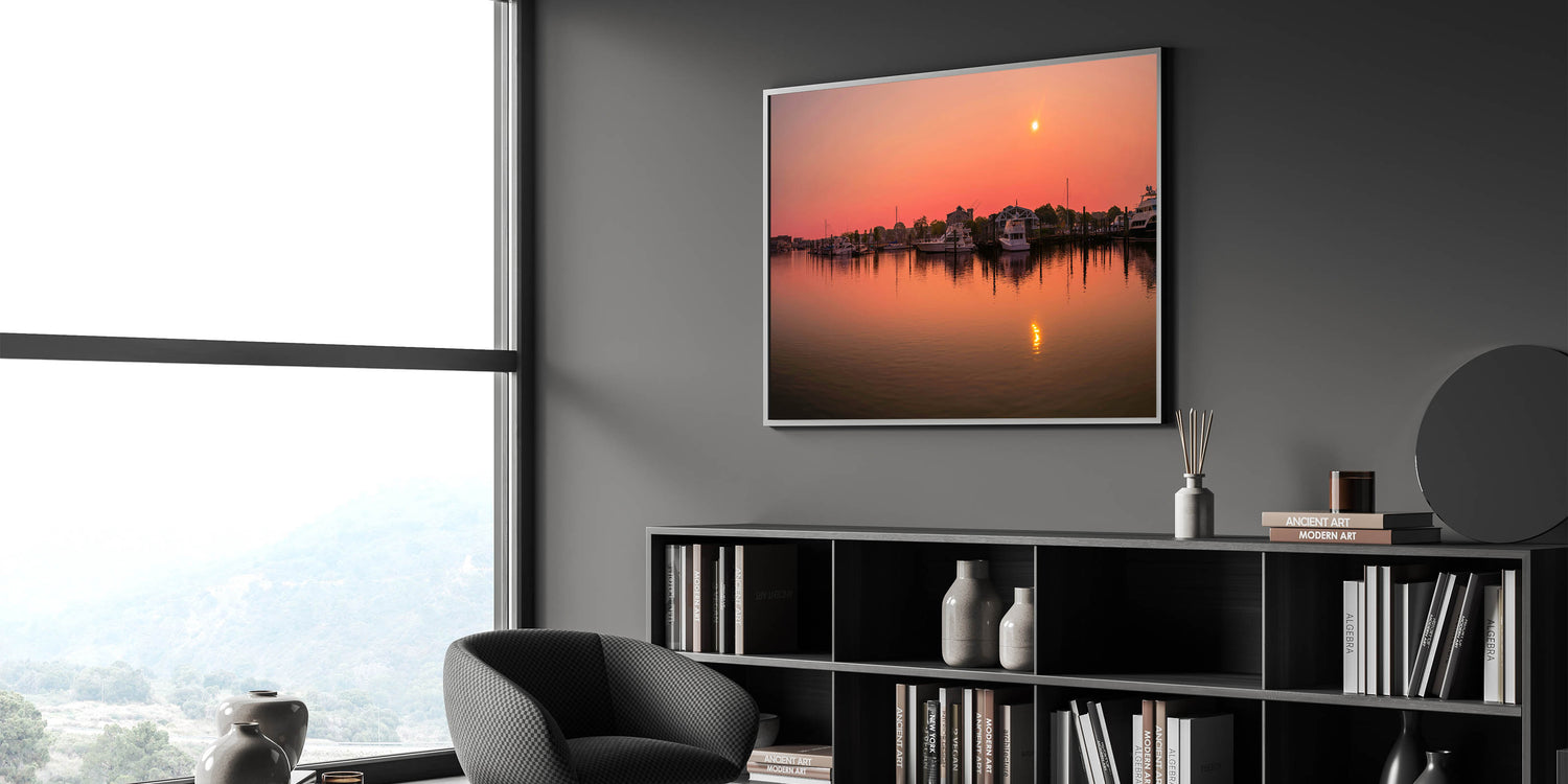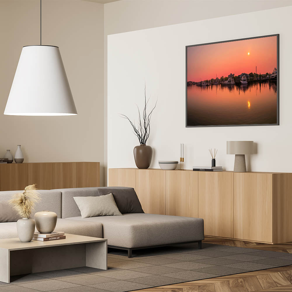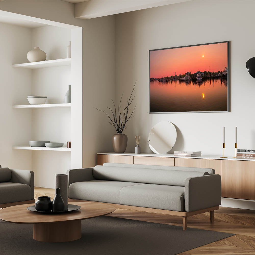 - High-quality print materials that preserve the rich, warm colors of the sunset and water.