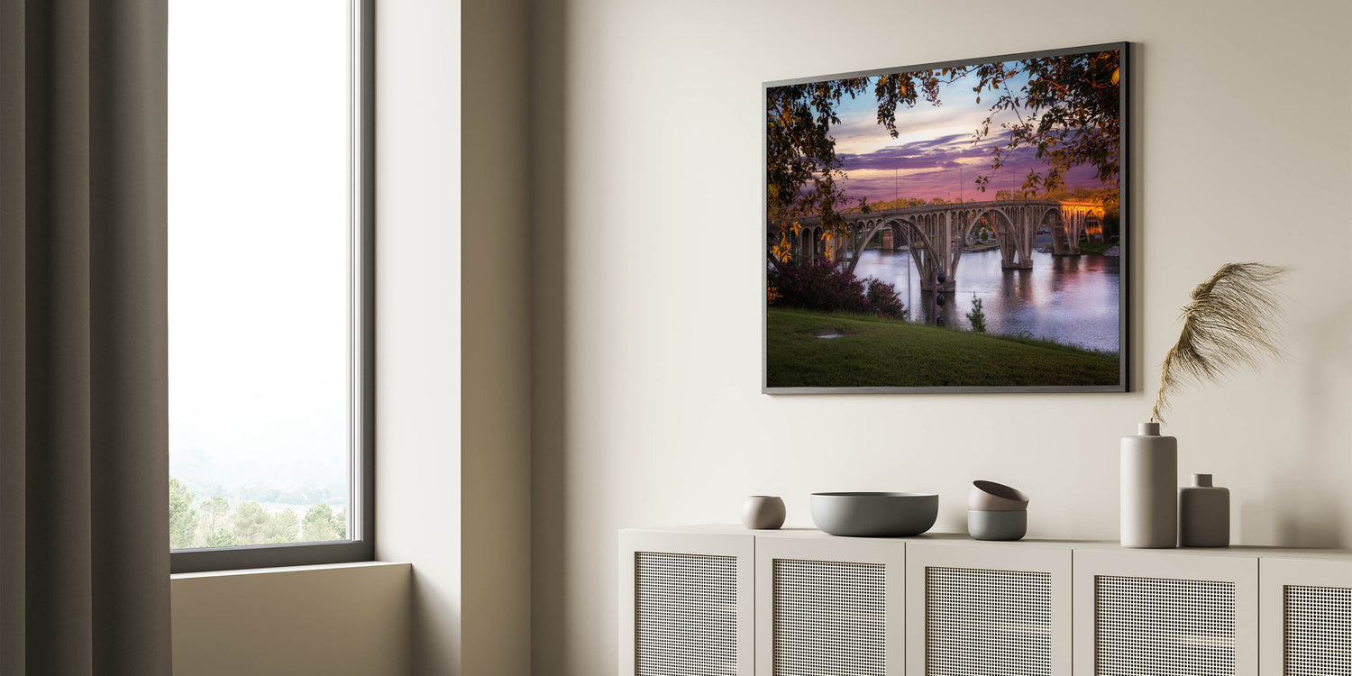 - High-quality Alabama nature prints showcasing a beautiful sunset and iconic bridge.