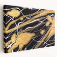 Add a touch of elegance to your space with this contemporary fluid art print. Featuring a striking contrast of black, gold, and white, this luxurious abstract wall decor showcases dynamic streaks of shimmering metallic tones against a bold dark background.
