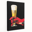 Add a touch of sophistication to your decor with this elegant beer vintage advertising poster. This nostalgic advertising print features a striking composition—a tall, frothy beer glass held by a stylish red-gloved hand, set against a sleek black background. The contrast of deep red, golden beer tones, and luxurious black creates a bold yet timeless look, making this historical advertising artwork a perfect statement piece.