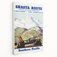 Take a journey through time with this vintage destination poster showcasing the breathtaking Shasta-Cascade region. The classic travel art features a Southern Pacific train making its way through stunning mountainous landscapes, highlighting the beauty of the Pacific Northwest. Perfect for train enthusiasts and lovers of historic nostalgic travel prints, this piece brings the allure of adventure and exploration to your space.