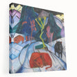 Immerse yourself in the vivid world of Franz Marc with "Bison in Winter (Red Bison)." This striking Expressionist artwork showcases a serene winter landscape, featuring resting red bison set against a backdrop of icy blues, lush greens, and snowy whites. The bold color palette and abstract forms reflect Marc's deep connection to nature and his ability to convey emotion through art.